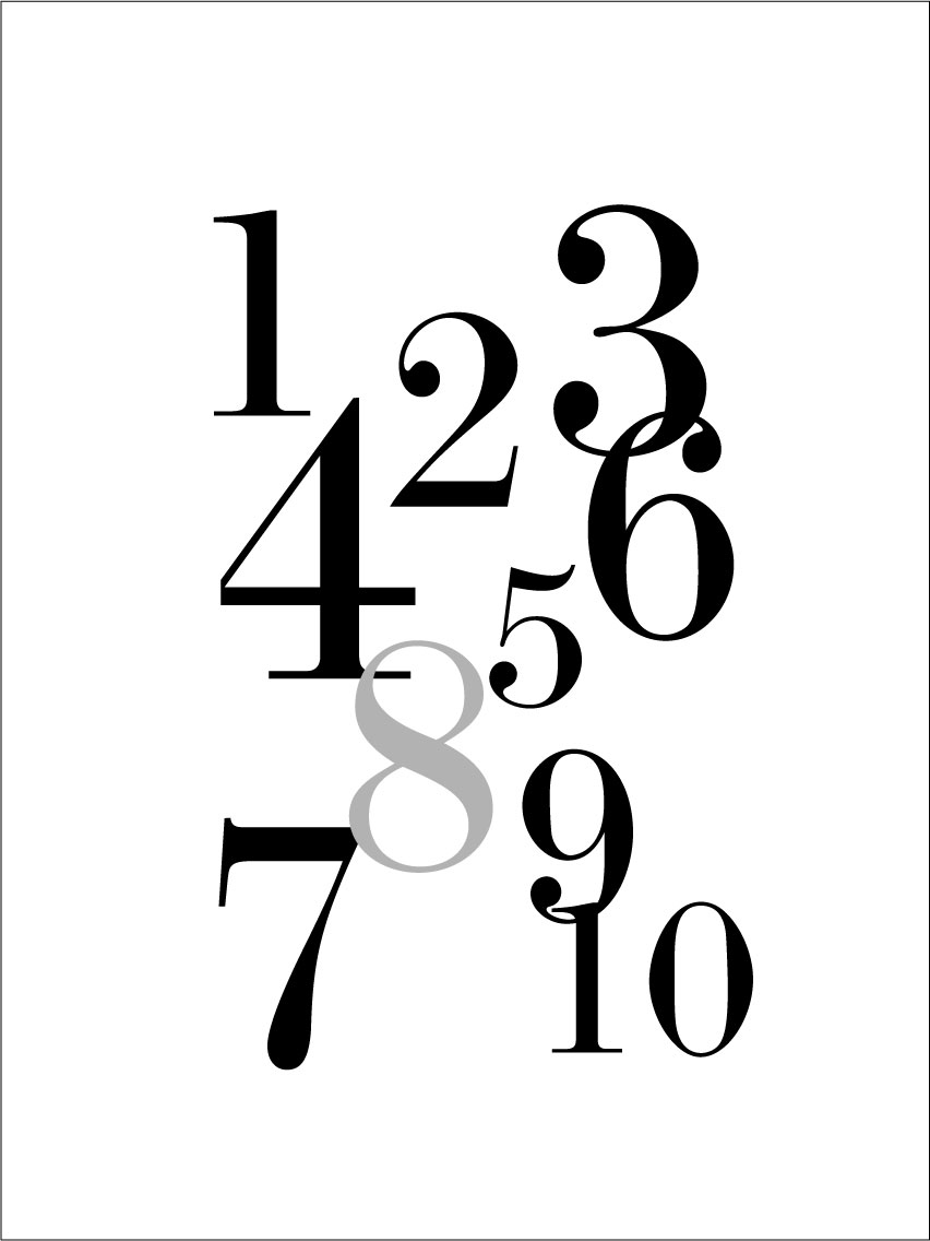 Plakát s čísly 1-10 v černé a šedé barvě. S jeho grafickým výrazem se motiv hodí stejně dobře jako samostatný prvek v dětském pokoji, tak i v ostatních částech domova a pasuje ke všem stylům interiéru. Plakát lze také kombinovat s plakátem A-Ž nebo s dalšími obrazy, například na téma přírodní vědy, k vytvoření vzrušující stěny s obrazy.