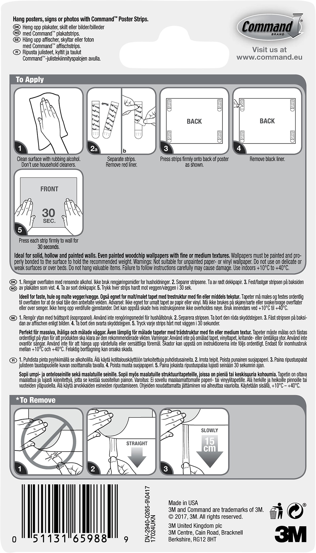 Command Poster Strips jsou rychlé a pohodlné řešení pro bezpečné zavěšení plakátů, kalendářů a dalších lehkých předmětů. Zavěšovací pásky se snadno připevňují na stěnu a mohou být použity na většině hladkých povrchů, jako jsou malované stěny, malované tapety, dlaždice, kov a dřevo. Neměly by být použity na nenatřené tapety, vinylové tapety nebo citlivé povrchy.