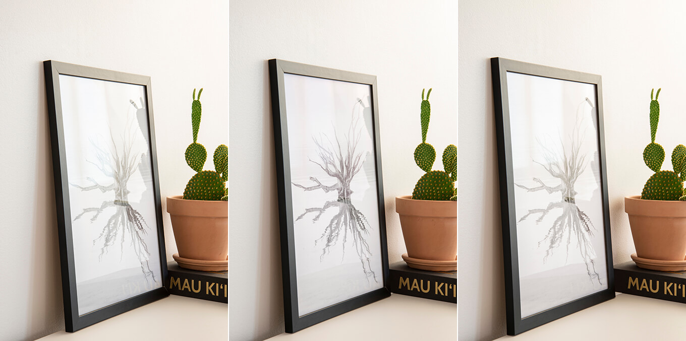 Vlevo vidíte rám s běžným sklem a vpravo rám s antireflexním sklem. Rozdíl je ve skutečnosti mnohem výraznější, ale i na těchto fotografiích můžete vidět, že motiv je výrazněji vidět na rámu s antireflexním sklem vpravo, i přestože je prostředí velmi světelné.