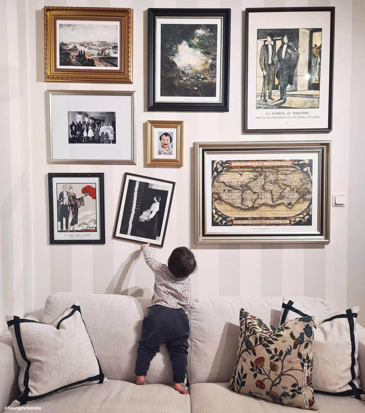 Nebojte se kombinovat různé materiály a barvy – dodá to interiéru hloubku. Zde byly zlaté rámy zkombinovány s černými a stříbrnými rámy v různých výškách, což přináší skvělý wow efekt!