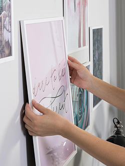Výběr rámů pomáhá stanovit tón pro nástěnnou galerii. Je běžné vybírat rámy v jedné nebo dvou barvách, aby všechny obrázky na stěně působily přirozeně propojeným dojmem. Pokud hledáte dramatičtější efekt, můžete s výhodou udělat opak a namíchat a sladit rámy v úplně různých barvách, tvarech a provedeních.