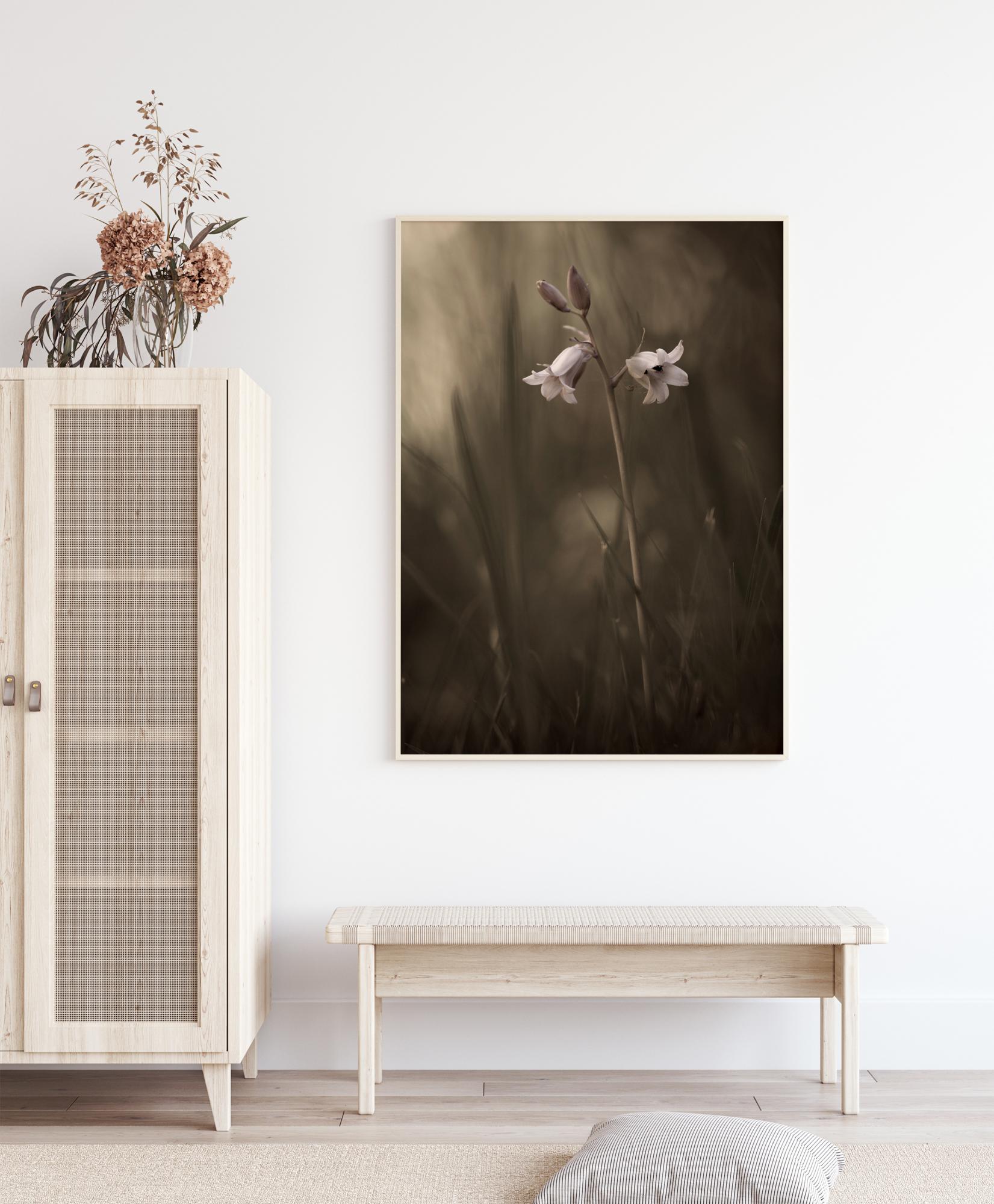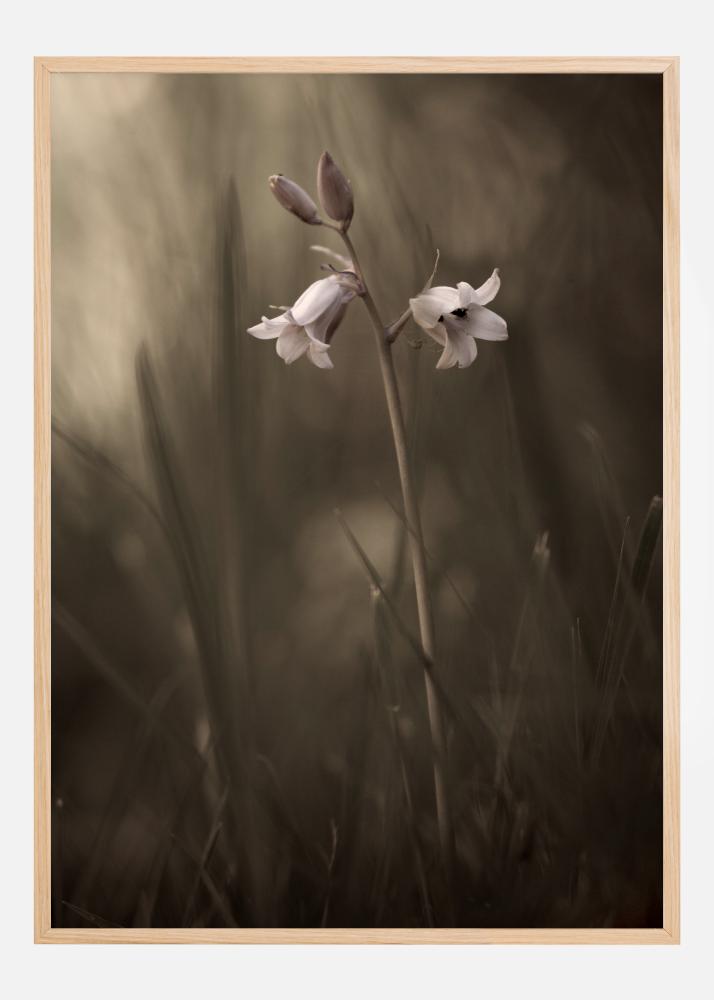 Měkký plakát s bílým květem na rozostřeném pozadí. Bílé a růžové zvonkovité květy kontrastují s měkkým travnatým polem v pozadí. Kombinujte tento jednoduchý plakát s odstíny zelené se světlou stěnou, aby květy v tomto nenápadném plakátu vynikly ještě více.