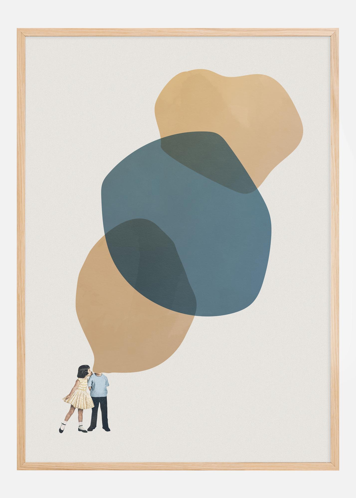 Tento jemný plakát zachycuje intimní okamžik mezi dvěma dětmi, které stojí blízko sebe a sdílejí šeptání. Motiv ukazuje tyto dětské postavy obklopené měkkými a překrývajícími se abstraktními tvary, které vytvářejí pocit teplého objetí kolem dua. Dětská důvěrná interakce je ztvárněna s jemností, která vyvolává vzpomínky na tajemné hry a tichá sdělení z dětství. Tento tisk zve do světa ticha a tajemství a stává se poutavým příběhem pro stěnu v každém druhu pokoje.