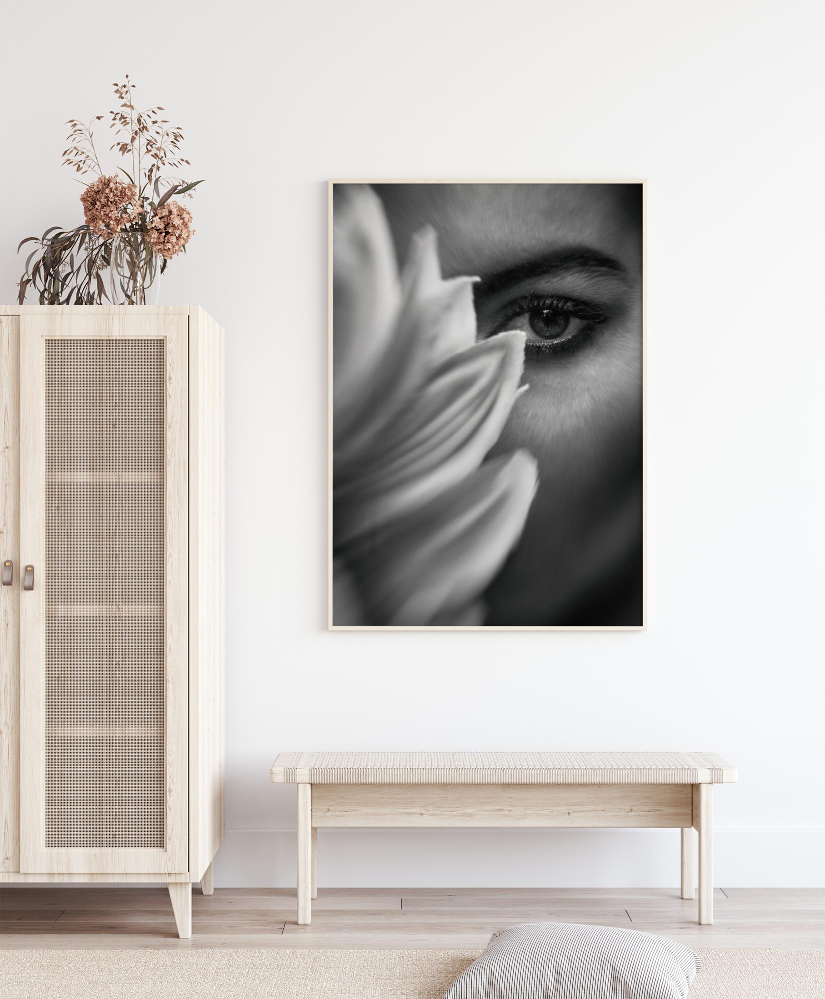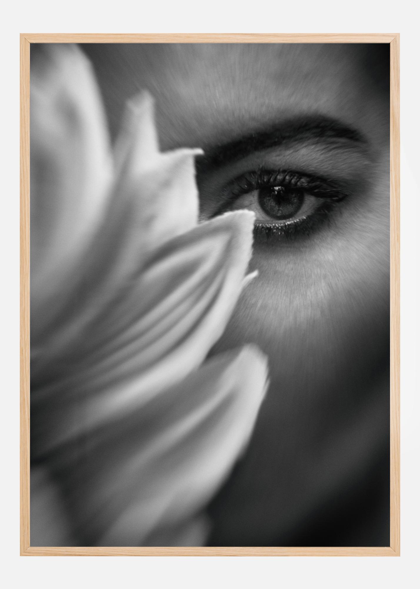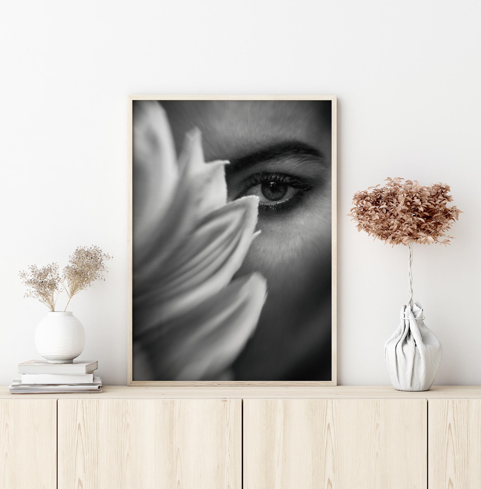 Fantastický plakát s květinou a ženským okem v detailu. Jemné černobílé tóny ji činí výraznou vůči všem barvám. Proměňte jakoukoli místnost v klidné místo pro duševní pozorování.