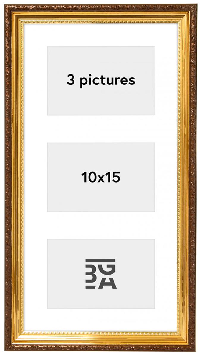 S touto kolážovou fotorámečkem můžete ozdobit svou zeď obrázky rodiny, přátel a fotografickými vzpomínkami z krásných okamžiků v životě. Rámeček má místo pro 3 obrázky o velikosti 10x15 cm. Zlatě zbarvený rámeček má krásný retro styl s dekorativním vnějším okrajem v teplém hnědém odstínu. Nástěnný držák je k dispozici.