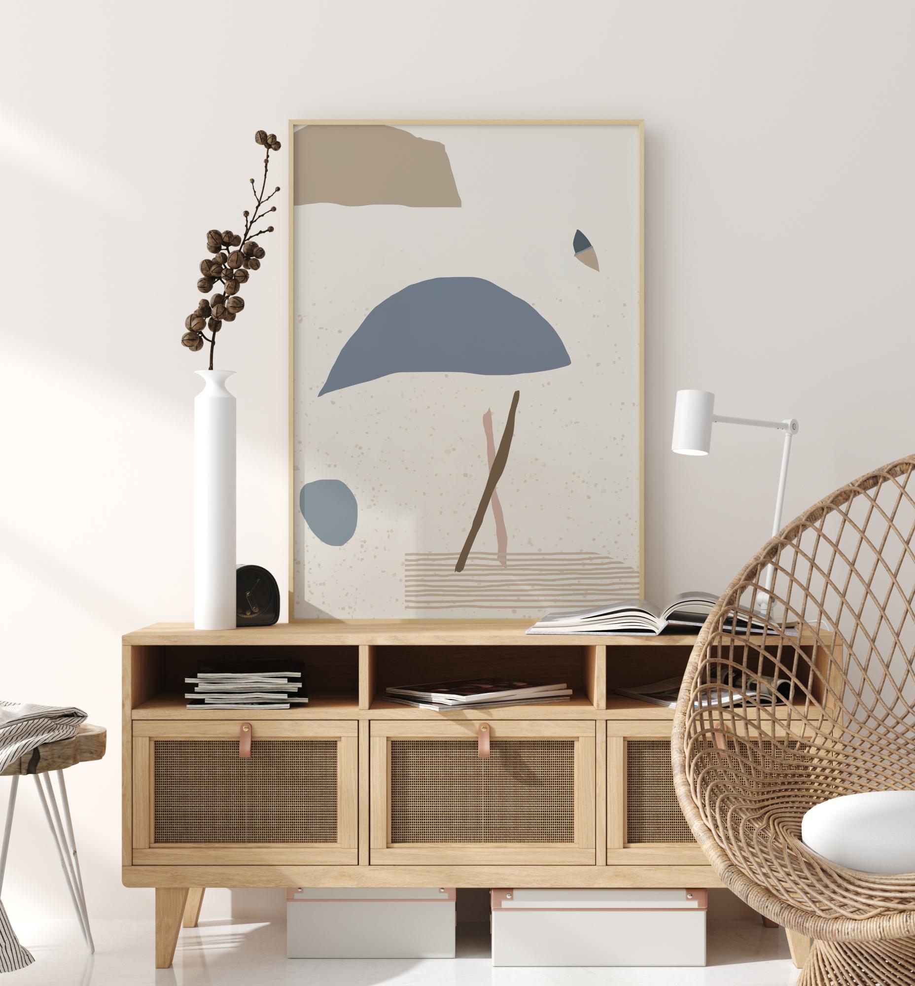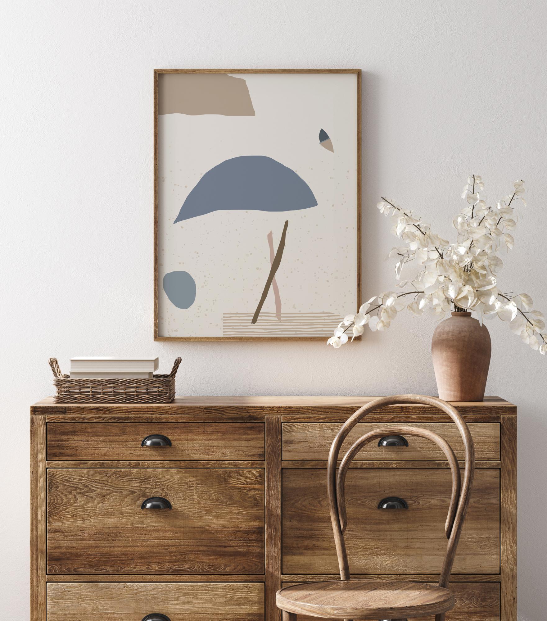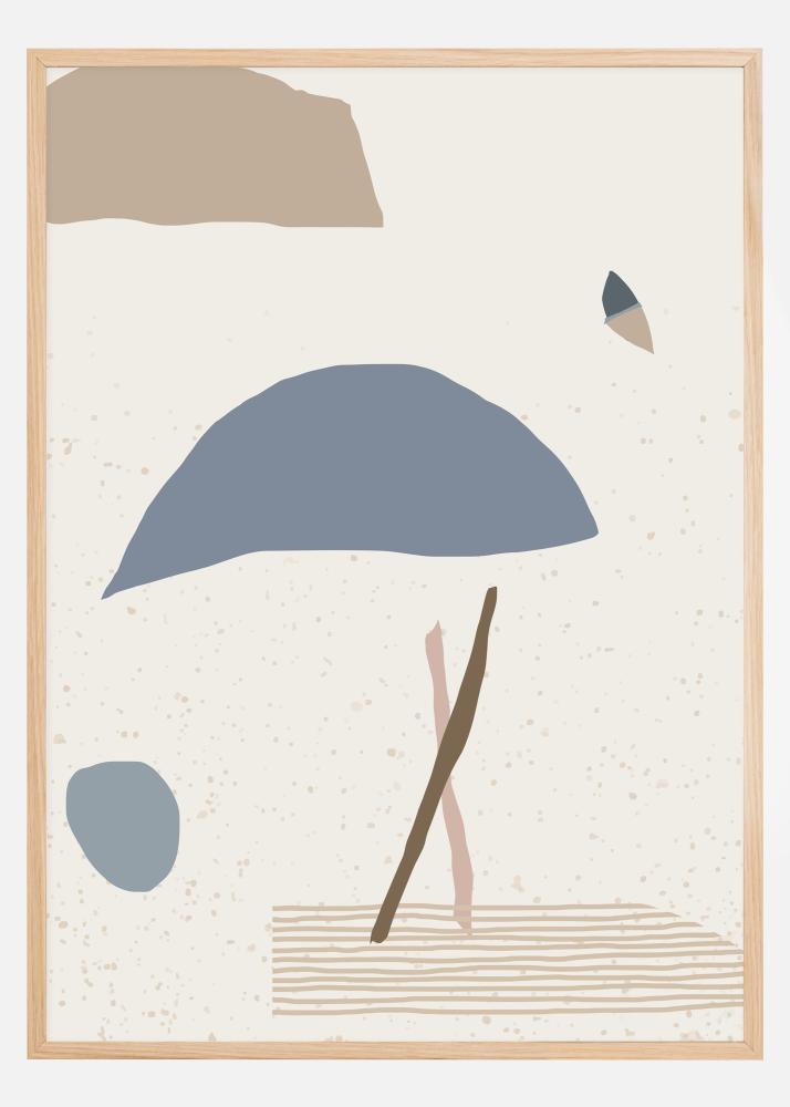 Abstraktní plakát s modrými, hnědými a šedými tvary na bílém pozadí. Vidíte, co chcete vidět v tomto minimalistickém díle, které vyvolává pocit člověka, deštníku, míče, motýla nebo oblaku. Přineste galerii do svého domova s tímto zamyšleným plakátem a povzbuďte diskusi o jeho významu.