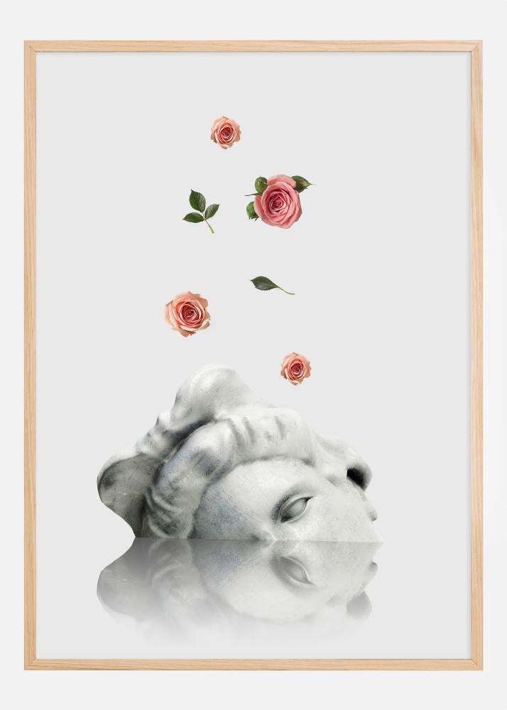 Tento umělecký plakát představuje snovou kompozici, kde je socha tváře, která se zdá klesat nebo rozpouštět, obklopena vířícími růžemi v různých stádiích kvetení a listoví. Je to poutavý obraz, který spojuje krásu kamene a flory, a nabízí pocit nadčasovosti i pomíjivosti.