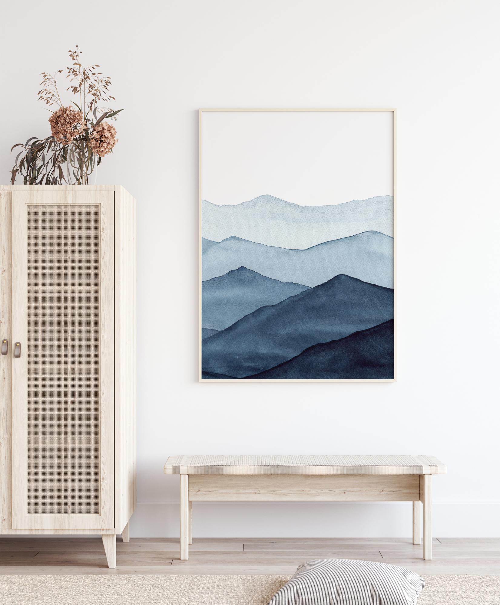 Fantastický minimalistický plakát s řadou modrých hor. Nejbližší hora má tmavý odstín modré, přičemž barvy se stávají vybledlými, jak se hory ztrácejí v dálce. Jemné modré barvy jsou perfektní pro vytvoření chladné, ale uklidňující atmosféry, když zíráte do dálky.