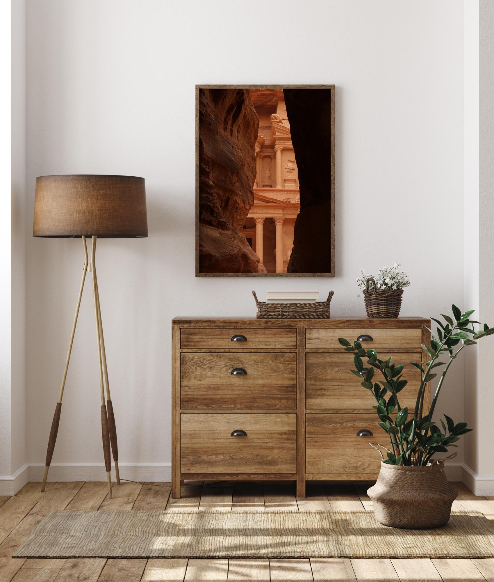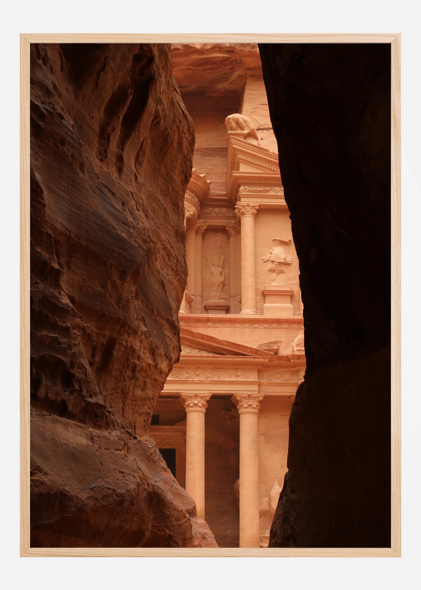 Plakát s motivem jednoho z rohů Petry v Jordánsku. Podívejte se na část fasády skrze červené skály tohoto úžasného starověkého divu. Zavěste si jej doma a vydejte se na cestu, aniž byste opustili dům, zatímco budete objevovat starou architekturu tohoto slavného místa.