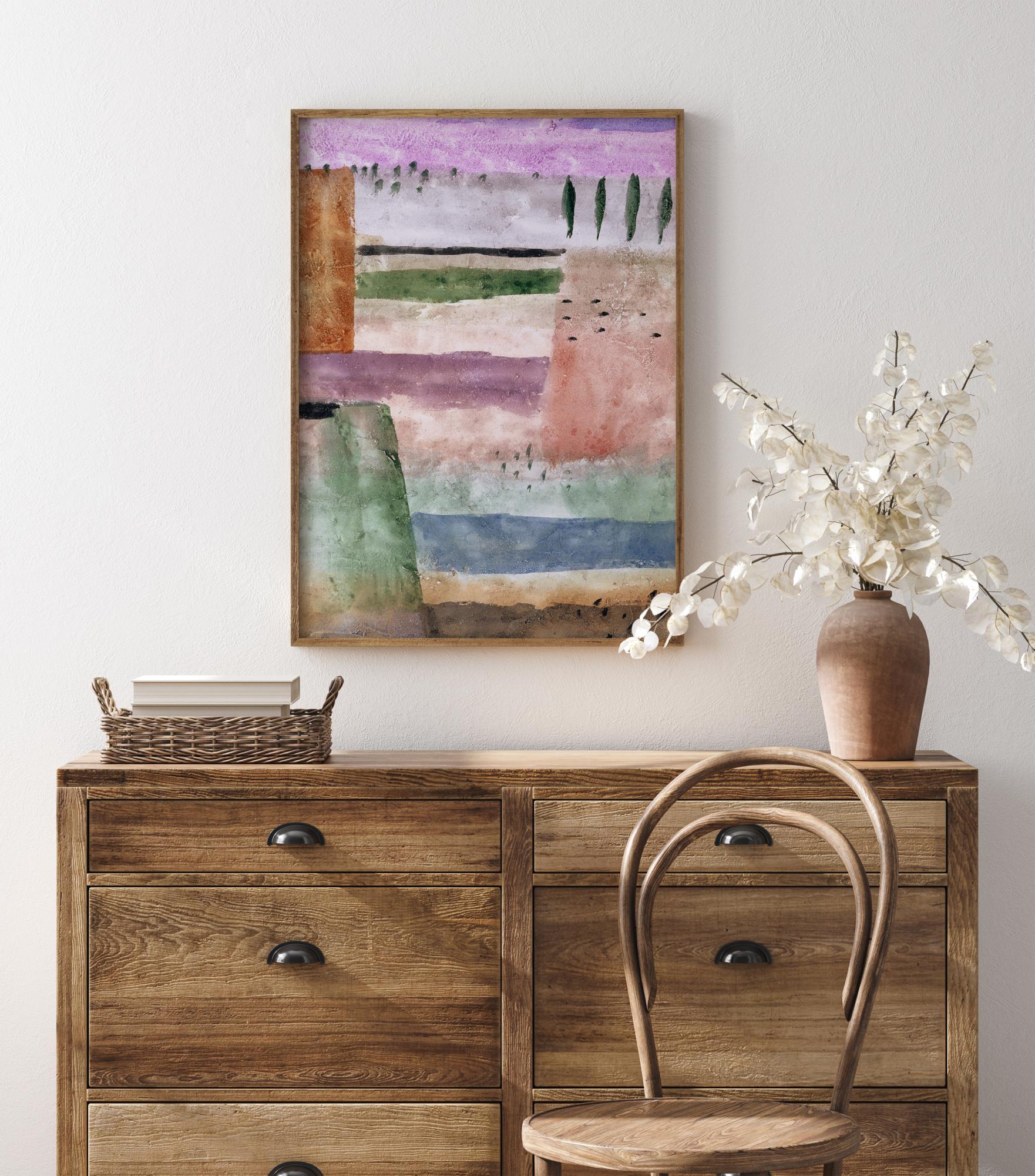 Pastelově zbarvený abstraktní plakát s vrstvenou, texturovanou strukturou. Plakát ukazuje, co se zdá být pláží, mořem, horami, trávou a stromy mizícími v dáli. Je zde několik modrých, fialových, oranžových a zelených polí v jemných pastelových barvách. Tato klidná scéna je uklidňující pro mysl.