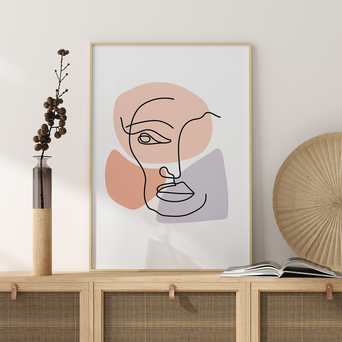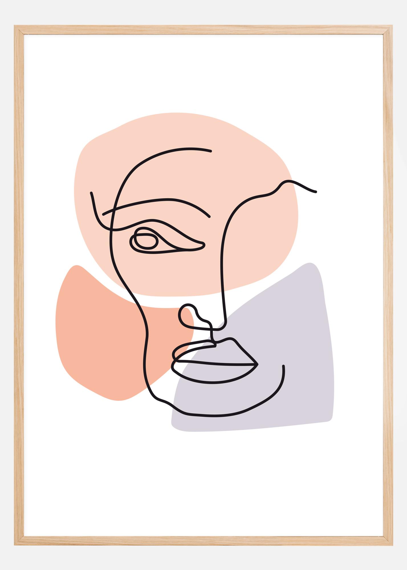 Abstraktní plakát meditativní tváře, který vyvolává zvědavost. Tenké černé čmárací čáry tvoří nos, oči, ústa a bradu této ostražité tváře. Jemné modré, růžové a broskvové tvary se nacházejí pod ním, aby dodaly tváři tvar. Kombinujte ho se silně zbarvenou zdí, abyste vytvořili skutečné prohlášení, které probudí představivost.