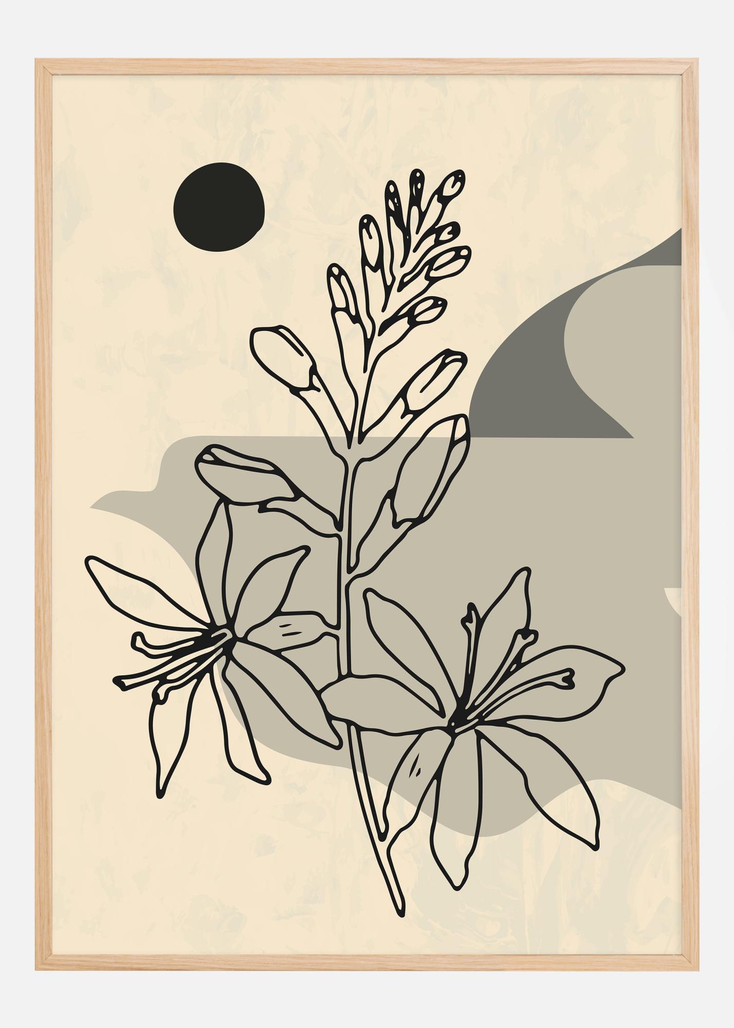 Tento esteticky přitažlivý plakát zachycuje abstraktní interpretaci kvetoucích květin, kde grafické linie splývají s organickými tvary. Dílo má neutrální béžové pozadí, doplněné tmavým kruhovým tvarem, který poskytuje kontrast a hloubku. V popředí se stylizované květiny a pupeny rozprostírají vzhůru v siluetě, vytvořené ostrými černými obrysy, které dodávají silný vizuální efekt.