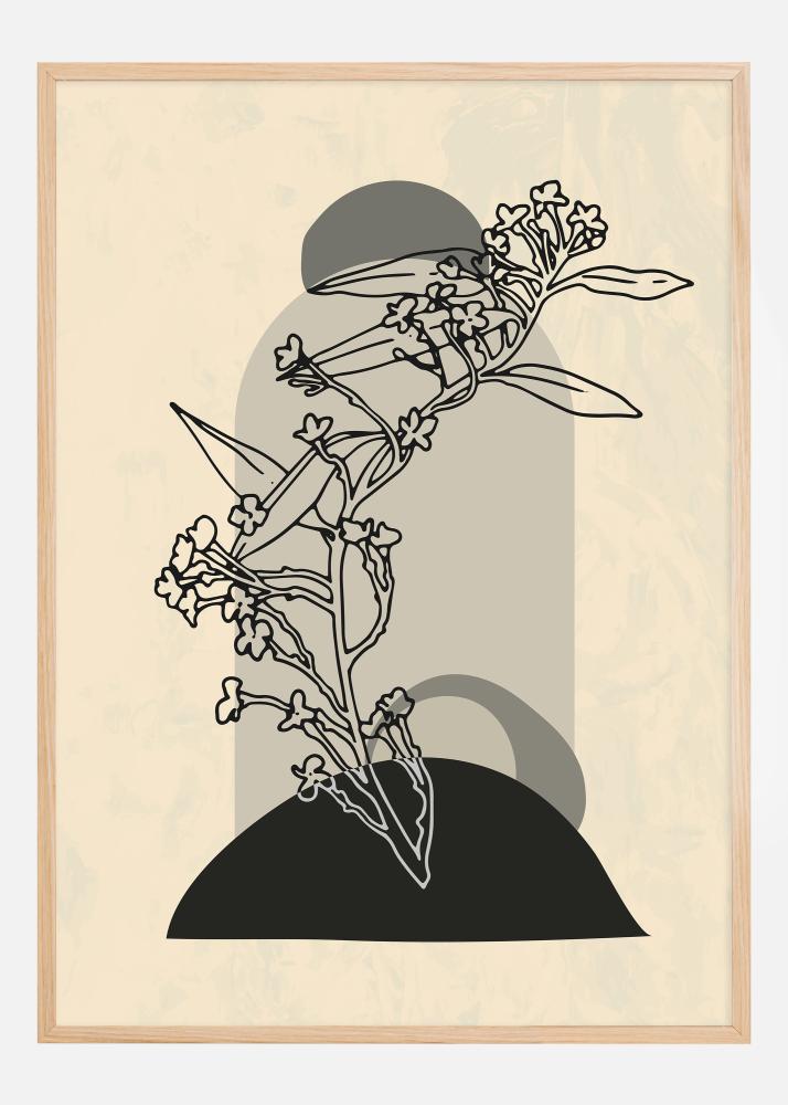 Tento sofistikovaný plakát zobrazuje abstraktní květenství, které kombinuje přírodní tvary s grafickými prvky pro současný pocit. Motiv používá jemnou barevnou škálu s měkkými béžovými tóny a odvážnými černými liniemi, což vytváří kontrast, který je jak nápadný, tak elegantní. Design klade velký důraz na kompozici a rovnováhu a umisťuje organické tvary květin a listů přes pevný černý půlkruh, který vytváří iluzi stínu a hloubky.