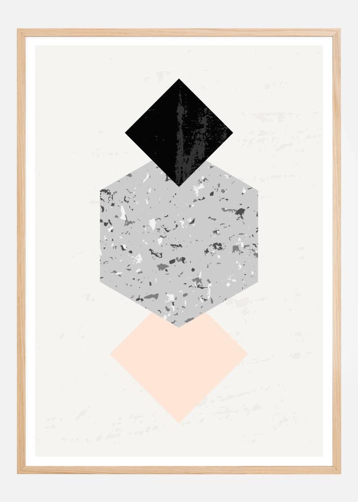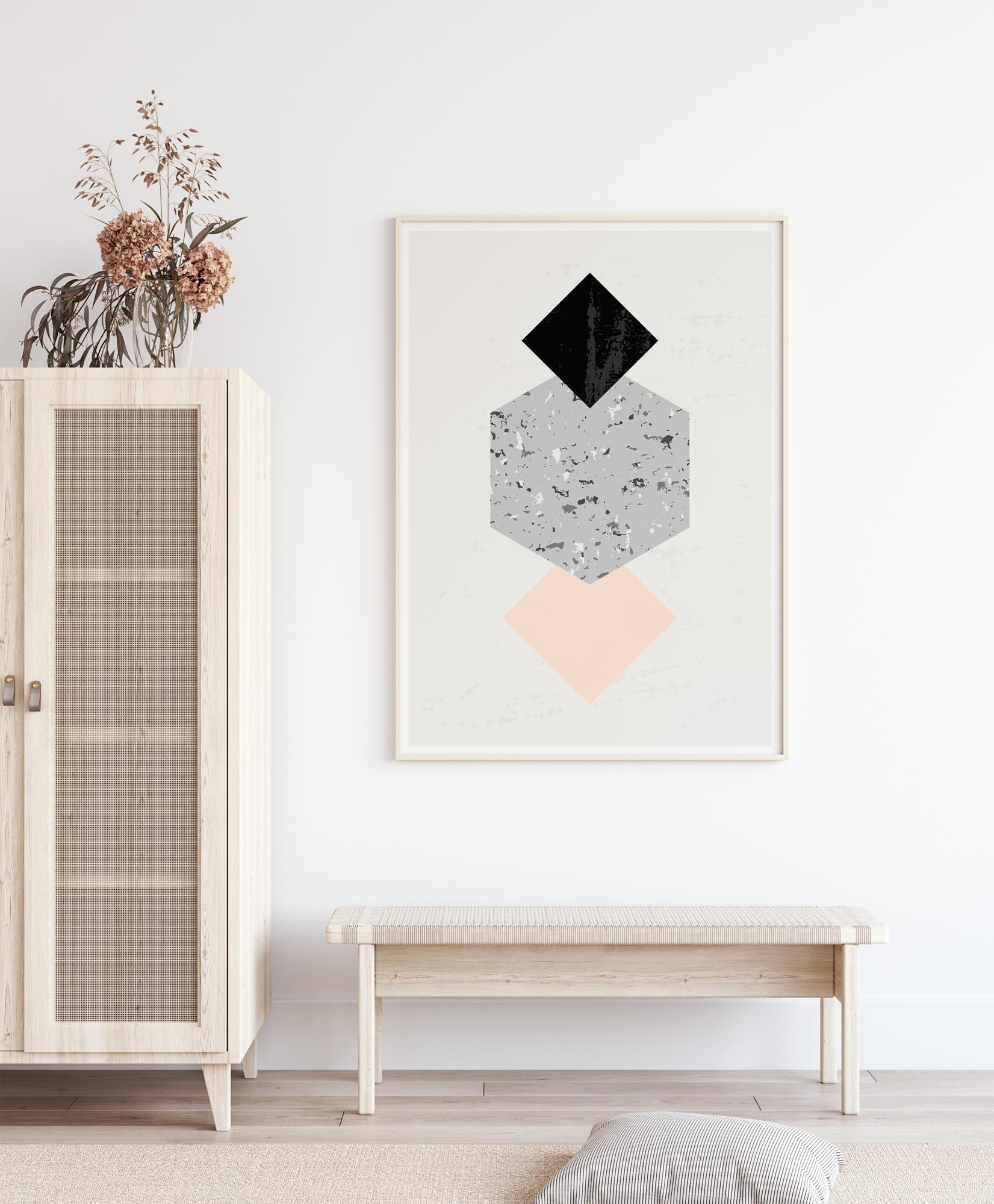 Geometrický abstraktní plakát se dvěma různými čtverci. Ačkoli jsou dvojrozměrné, úhly čtverců vytvářejí iluzi krychlí. Tyto krychle jsou vyplněny zábavnými kameny a barevnými tečkami v modré, šedé a černé barvě. Vytvořte dramatickou zeď, když tento jednoduchý kousek zkombinujete s výrazně barevnou stěnou.