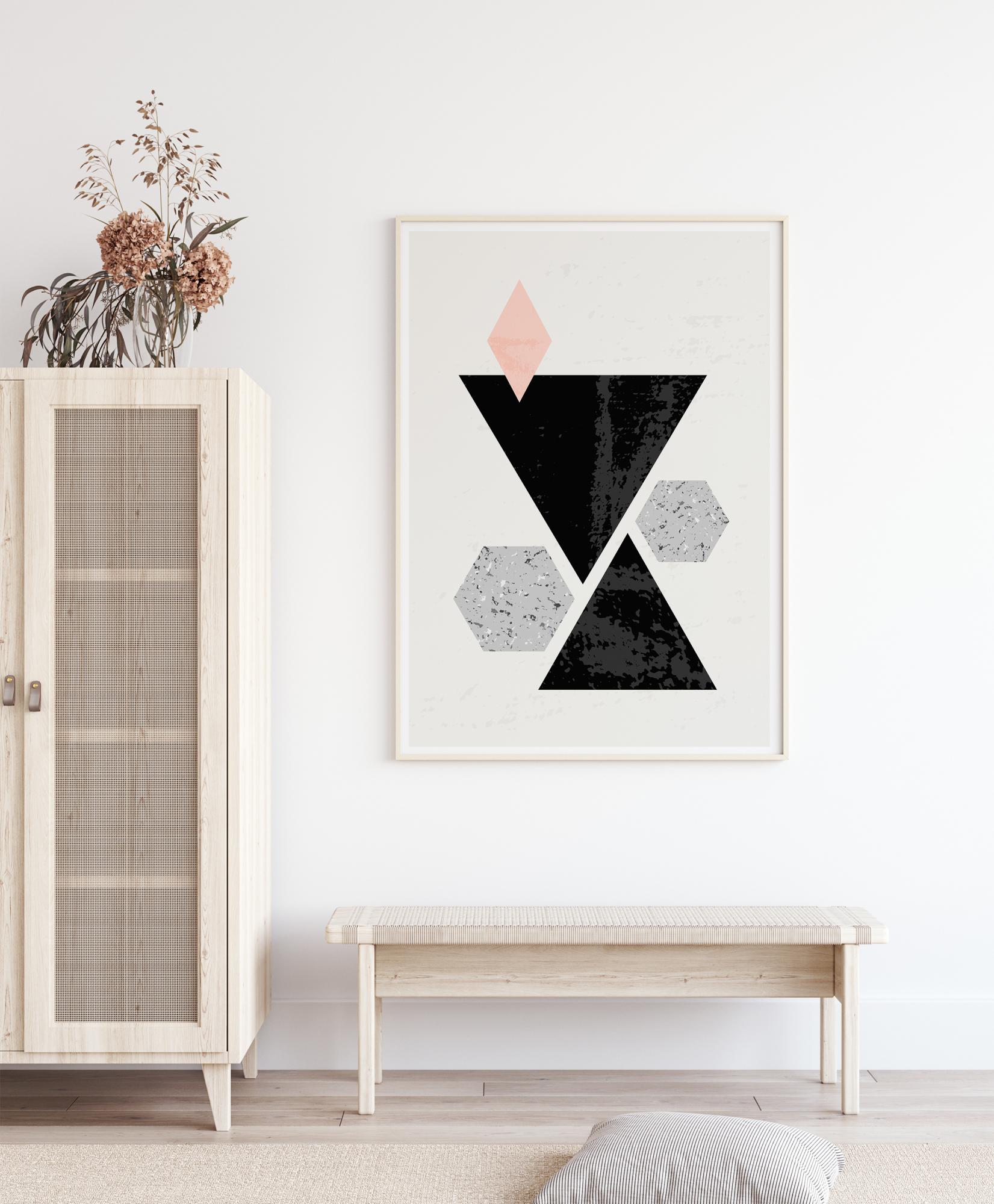 Silný geometrický plakát plný abstraktních tvarů, které všechny zapadají do soudržného designu. Dva velké černé trojúhelníky stojí spolu a tvoří přesýpací hodiny. Kolem nich je růžový diamant a dva modré kamenné šestihranné tvary, které všechny dobře zapadají do tohoto silného a zajímavého obrazu. Zavěste tento obraz v hale pro silný výraz.