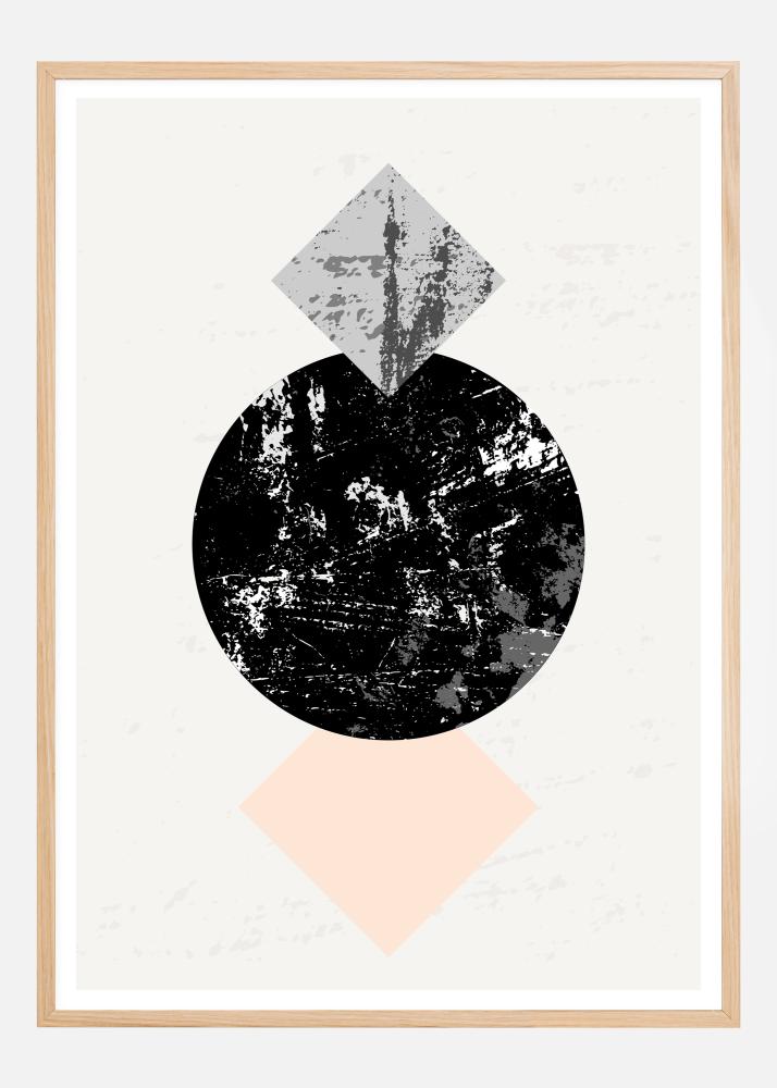 Geometrický abstraktní plakát se dvěma čtverci obklopujícími kruh. Černý kruh má bílou mramorovou texturu a je lemován modrým mramorovaným čtvercem a růžovým čtvercem. Každé místo je umístěno na bodu, který zaměřuje oko na kruh ve tvaru země uprostřed. Přidejte dramatičnost jednoduché zdi tímto vyjádřením uměleckého díla.