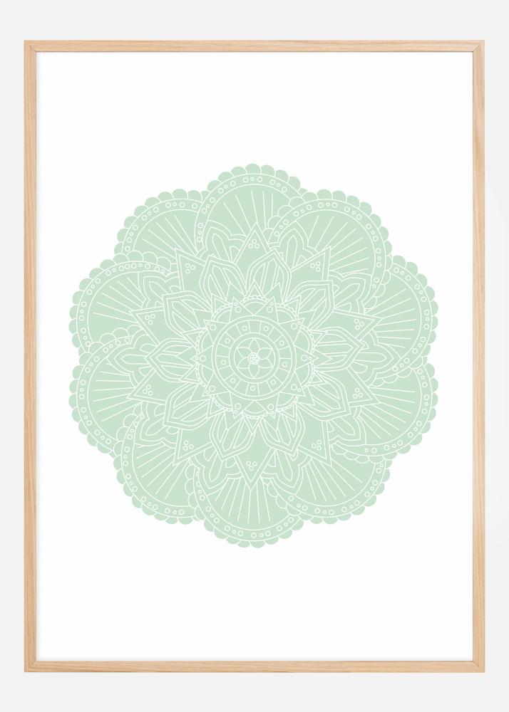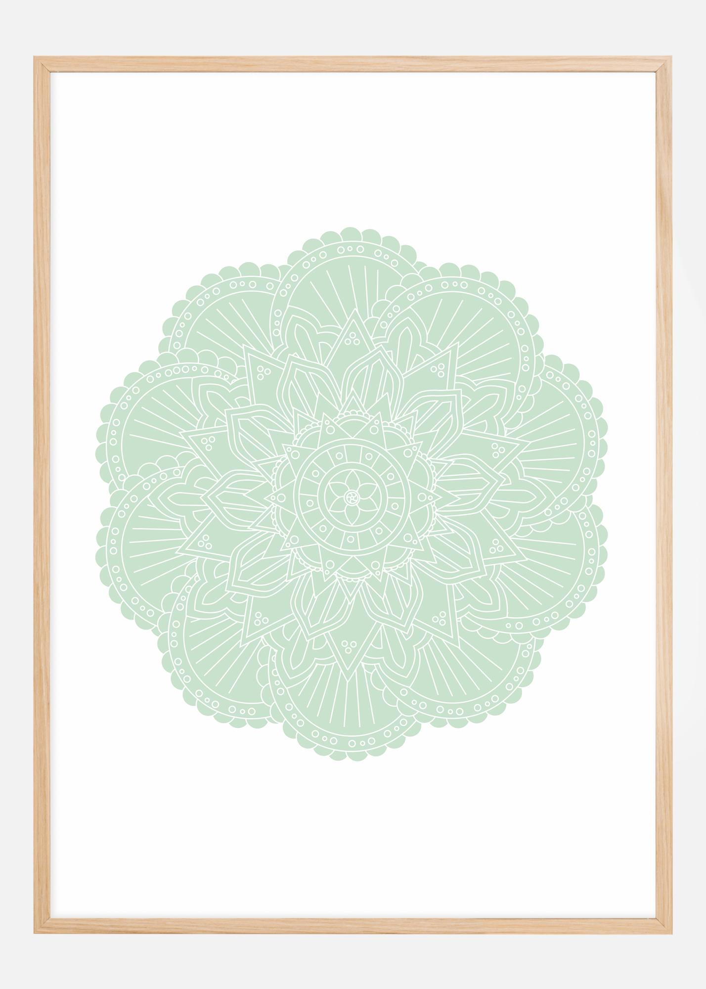 Tento plakát zobrazuje symetrickou mandalu v uklidňujících zelených odstínech, obraz, který je jak vizuálně přitažlivý, tak symbolicky bohatý. Mandala, známá pro své využití v meditaci a relaxaci, nabízí složitý vzor, který zvědavé oko zve k prozkoumání a mysl ke toulkám. Jemné tóny přispívají k pocitu rovnováhy a harmonie, což činí toto umělecké dílo dokonalým prostředím pro kontemplaci a klid.