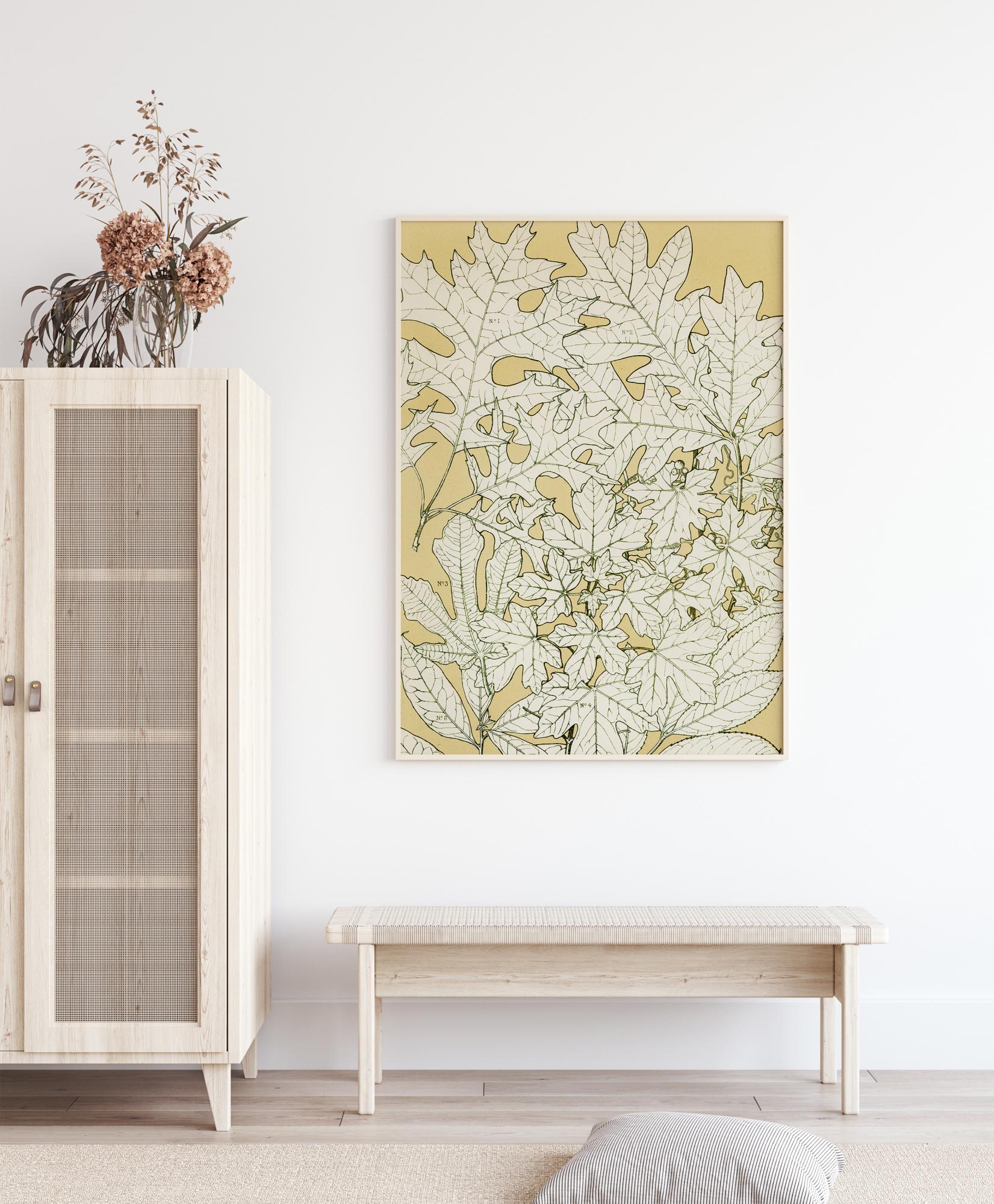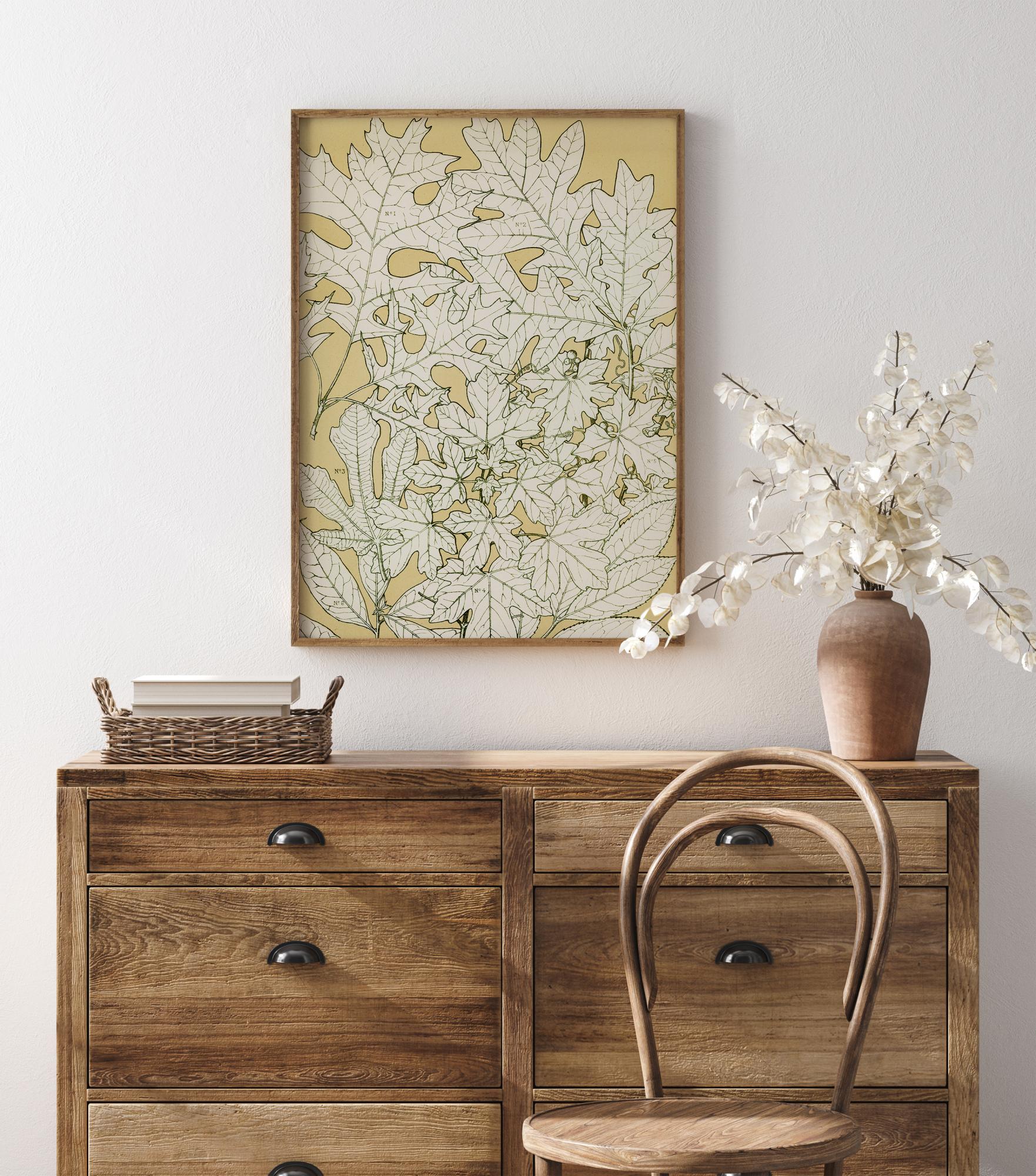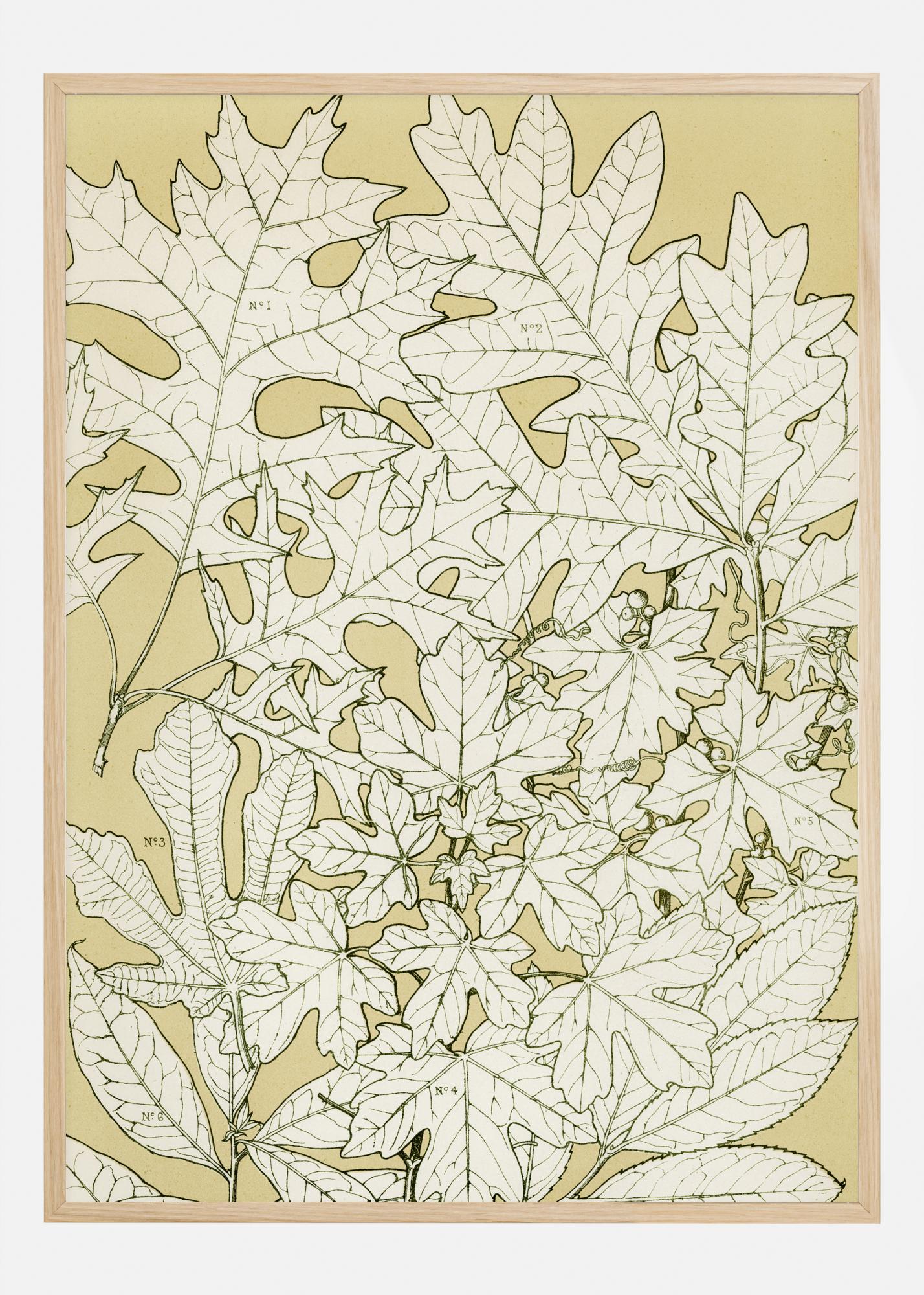 Abstraktní plakát s listy s jednoduchými kreslenými listy na bledě zlatém pozadí. Různé listy jsou pečlivě nakresleny, včetně jejich žilek a stonků. Absence barvy umožňuje, aby vynikly na pevném pozadí, což ukazuje všechny detaily. Zavěste tento plakát na jednoduchou stěnu, abyste získali přirozený pocit ve vašem domově.