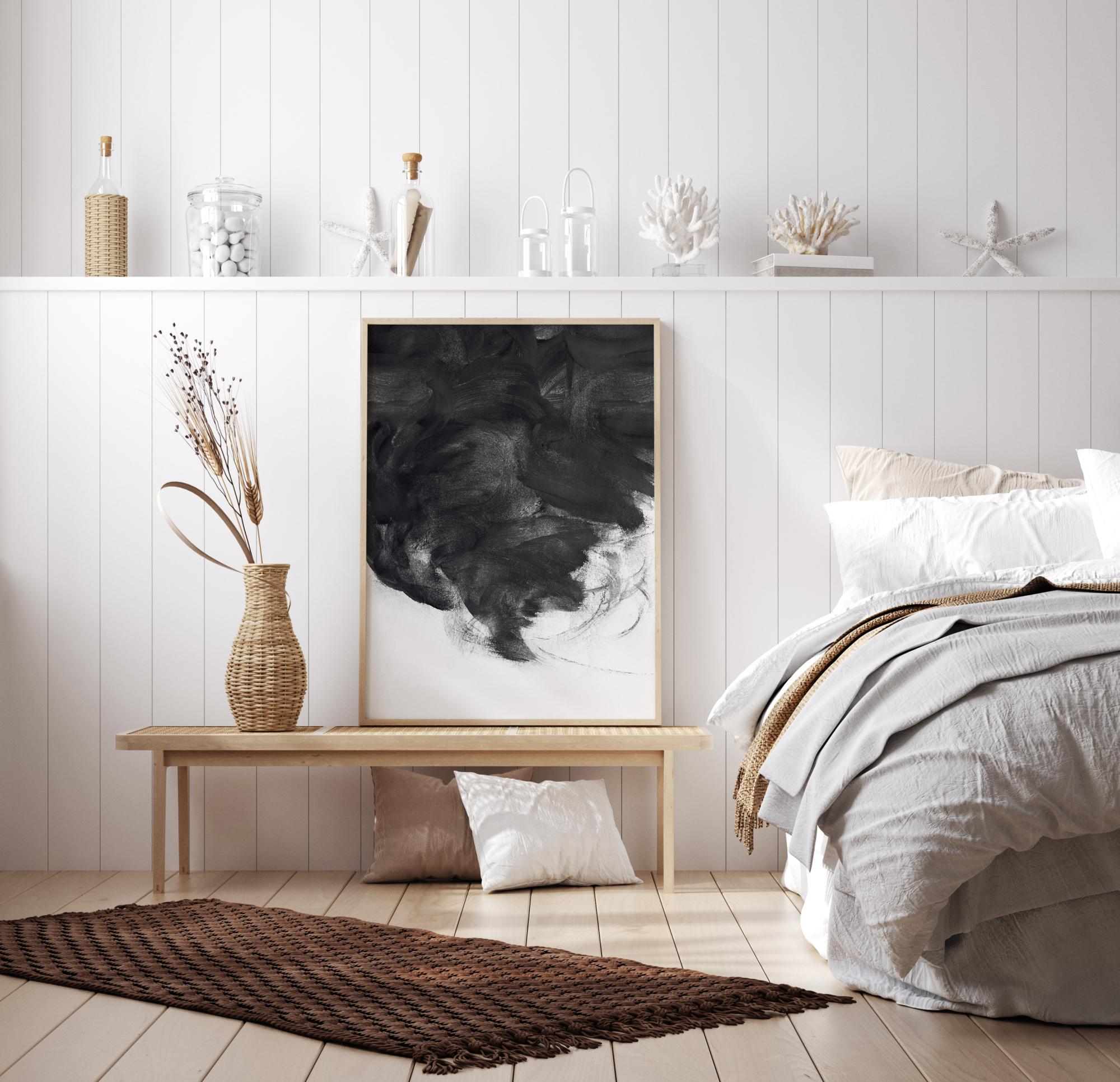 Abstraktní plakát černé spirály. Tento úžasný černobílý kousek vede oko od vrcholu ke středu skrze černou spirálu. Kde se černá setkává s bílou, si můžete představit jeskyni, bouři, vichřici nebo mrak v tomto plakátu plném dynamiky. Umístěte jej na světlou stěnu pro dramatický a epický pocit.