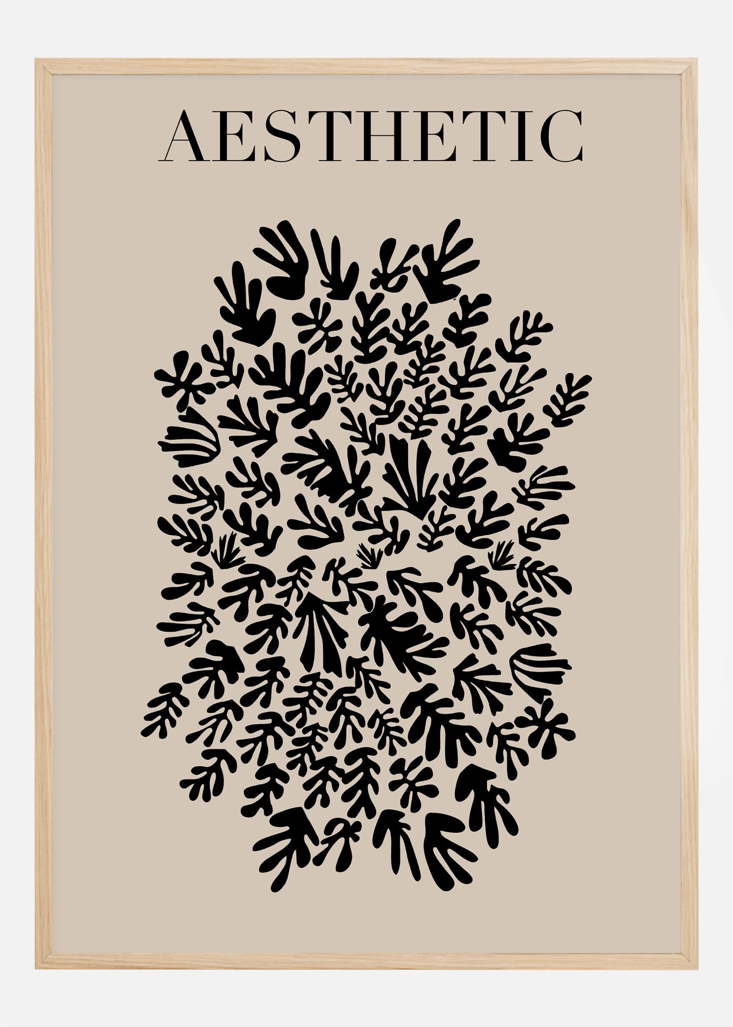 S moderním výrazem a jednoduchou barevnou paletou, která se omezuje na černou a béžovou, tento tisk vytváří uklidňující a vyvážený dojem. Slovo "AESTHETIC", umístěné v horní části motivu, slouží jako silná připomínka věčné krásy designu a přírody. Tento plakát by se skvěle vyjímal v interiéru, kde si přejete vytvořit oázu klidu a inspirace, nebo jako součást větší galerie obrazů pro vytvoření sjednocujícího vizuálního zážitku.