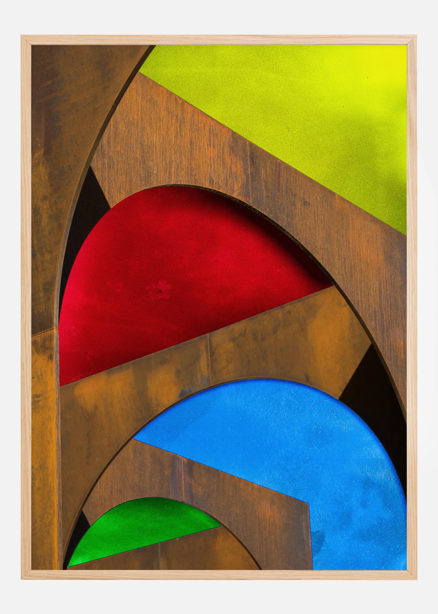 Abstraktní poster se světlými a barevnými tvary. Primární barvy plní toto dílo červenými, žlutými a modrými polokruhovými tvary. Tyto tvary jsou spojeny s rovnými dřevoryty na černém podkladu. Oživte nudnou a hladkou zeď nebo ji spojte s jinou existující odvážnou barvou, aby dílo bylo kompletní.
