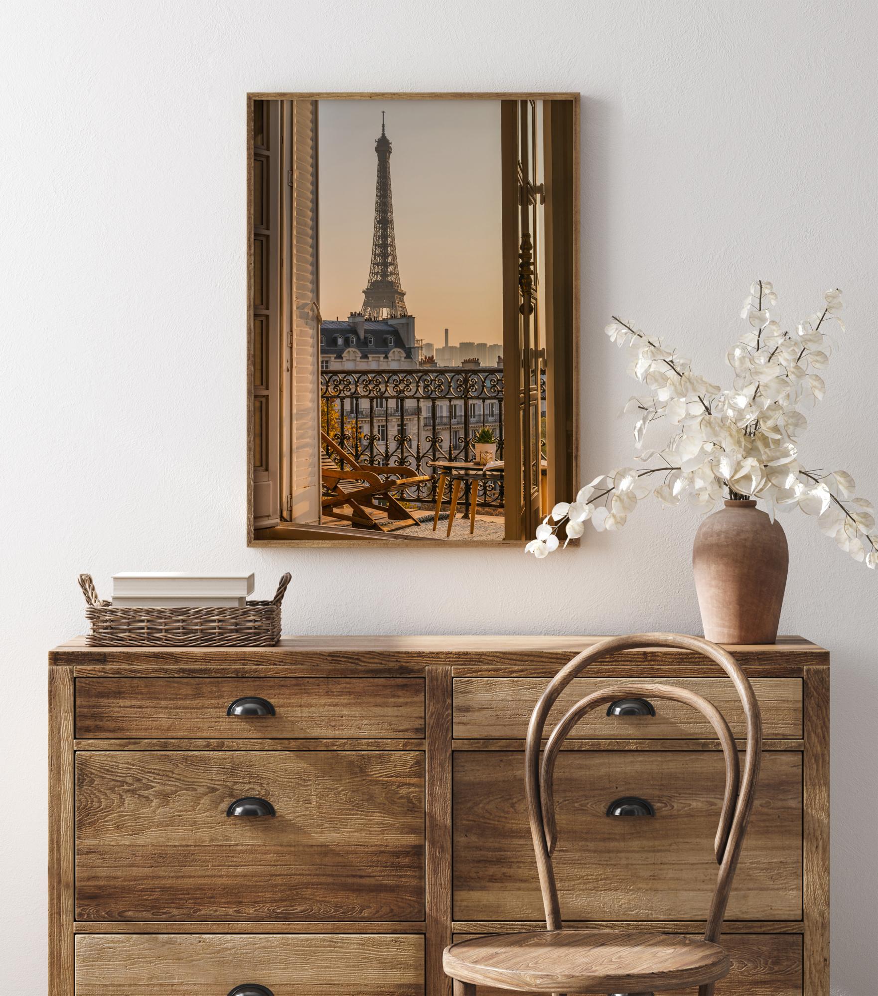 Krásný plakát městské krajiny zobrazující Eiffelovu věž v dálce. Ozdobný balkon je místem této fotografie s jemným ranním světlem pokrývajícím židli a zábradlí. Věž stojí vysoko a přitahuje pohled. Skoro můžete cítit chladný vánek přes otevřené dveře.