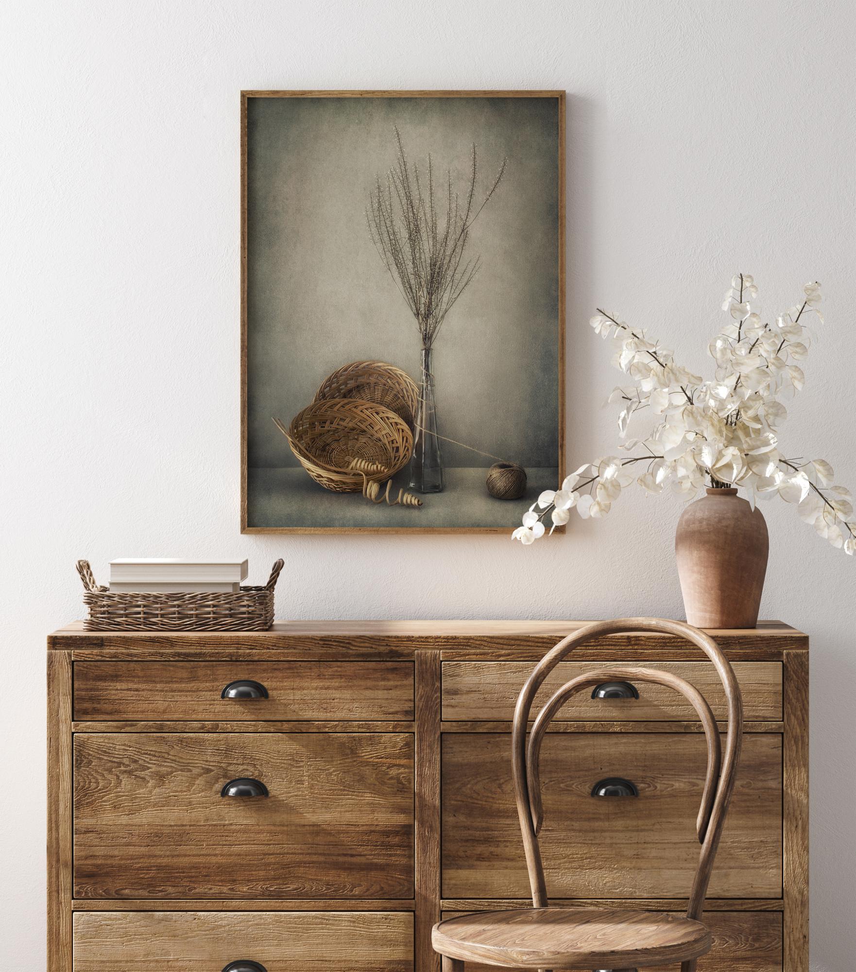 Zátiší s koši, keramickým hrnkem a skleněnou lahví se sušenou trávou. Toto dílo má jemné sépiové a šedé tóny, které vytvářejí měkké a harmonické dílo. Přineste do domova trochu klidu s tímto plakátem a zkombinujte ho s neutrální stěnou, aby nevynikl příliš mnoho.