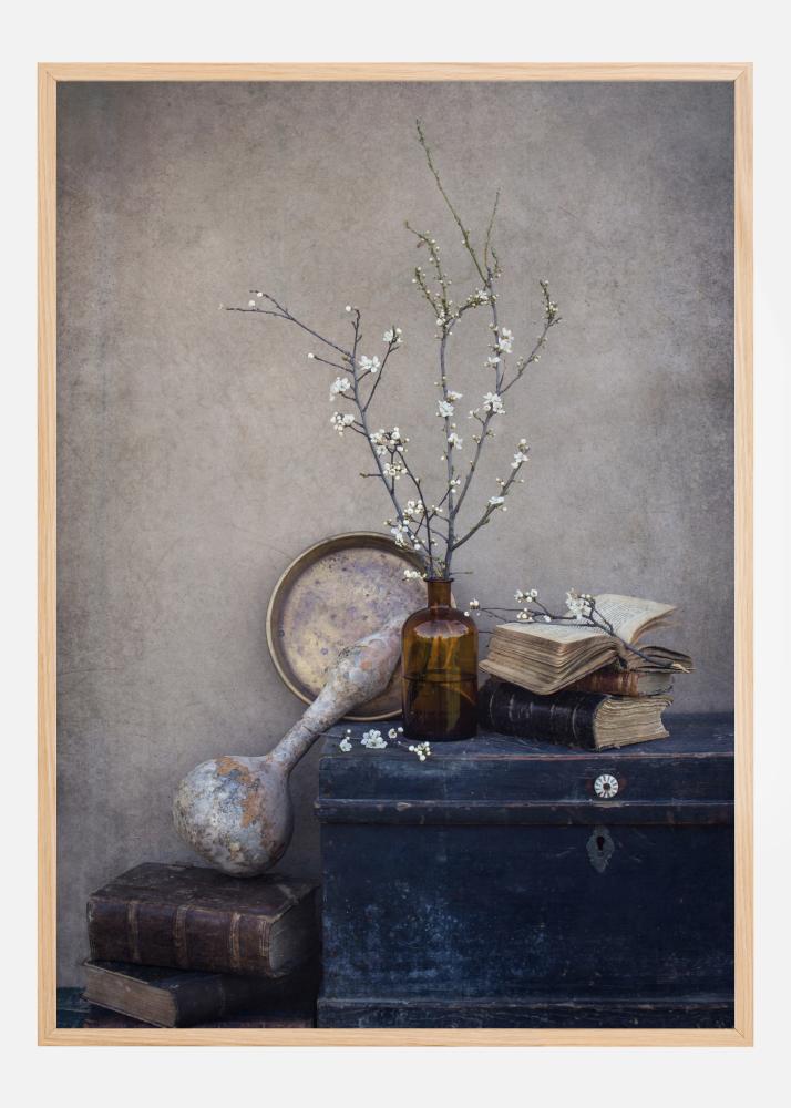 Zátiší s modrou truhlou s vázou, talířem, starými knihami a pupeny květin. Zátiší je na jednoduchém šedém pozadí, které umožňuje modré truhle vyniknout uprostřed. Pokud si přejete rustikální vzhled, můžete tento obraz umístit na neutrální zeď a užívat si pupeny jarních květin na holých větvích.