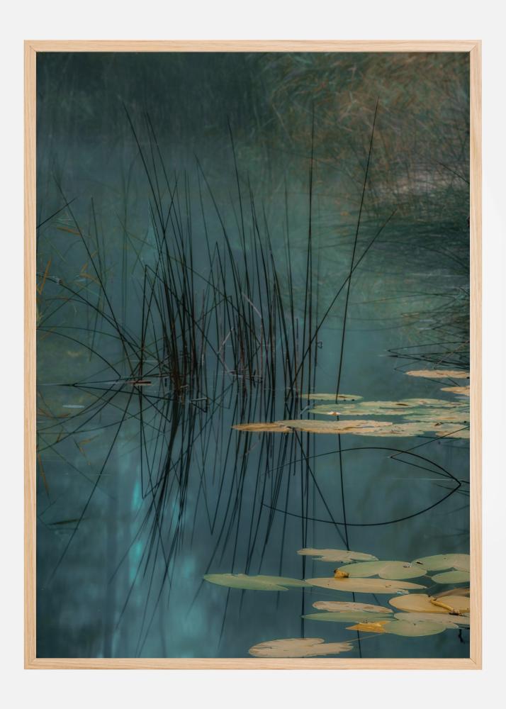 Přírodní plakát s úžasným modrým jezerem s lekníny a rákosím. Jemné barvy splývají a vytvářejí skutečně klidný obraz. Klidná voda vytváří dokonalé odrazy rákosí. Spojte se s přírodou, když si ho zavěsíte na zeď a ponořte se do klidu.