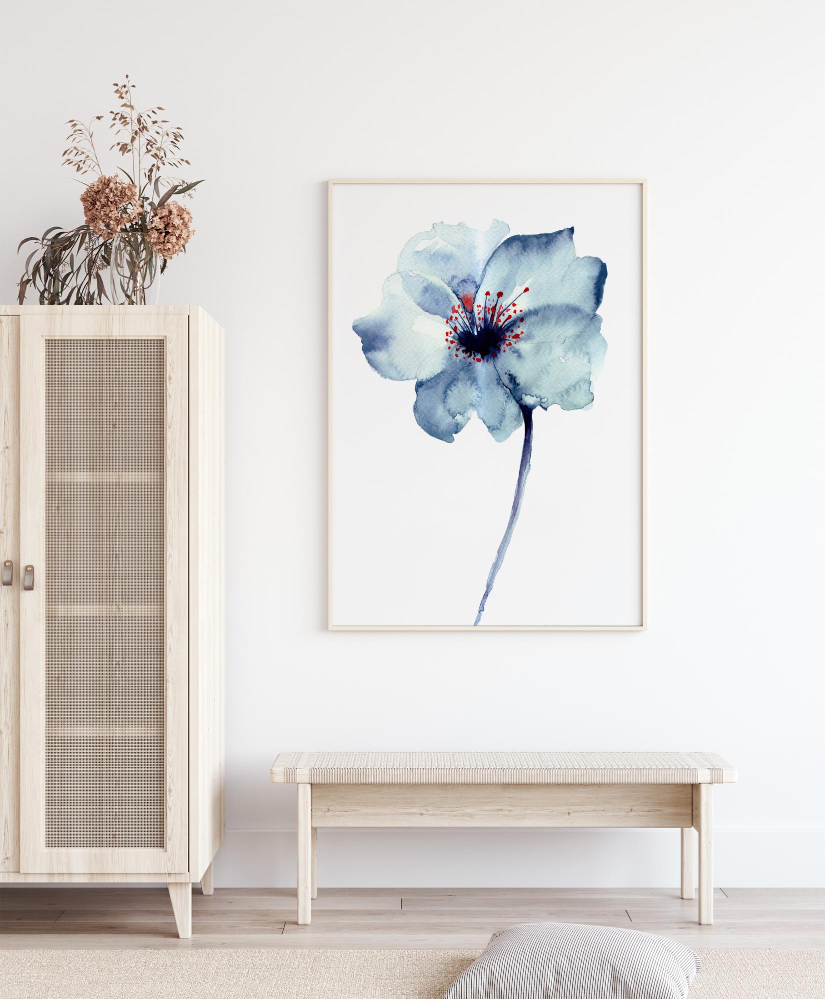 Vznešený květ namalovaný modrou a červenou akvarelovou barvou. Krásný plakát v celé své jednoduchosti, který se hodí stejně dobře do kuchyně nebo chodby jako do obývacího pokoje nebo ložnice.