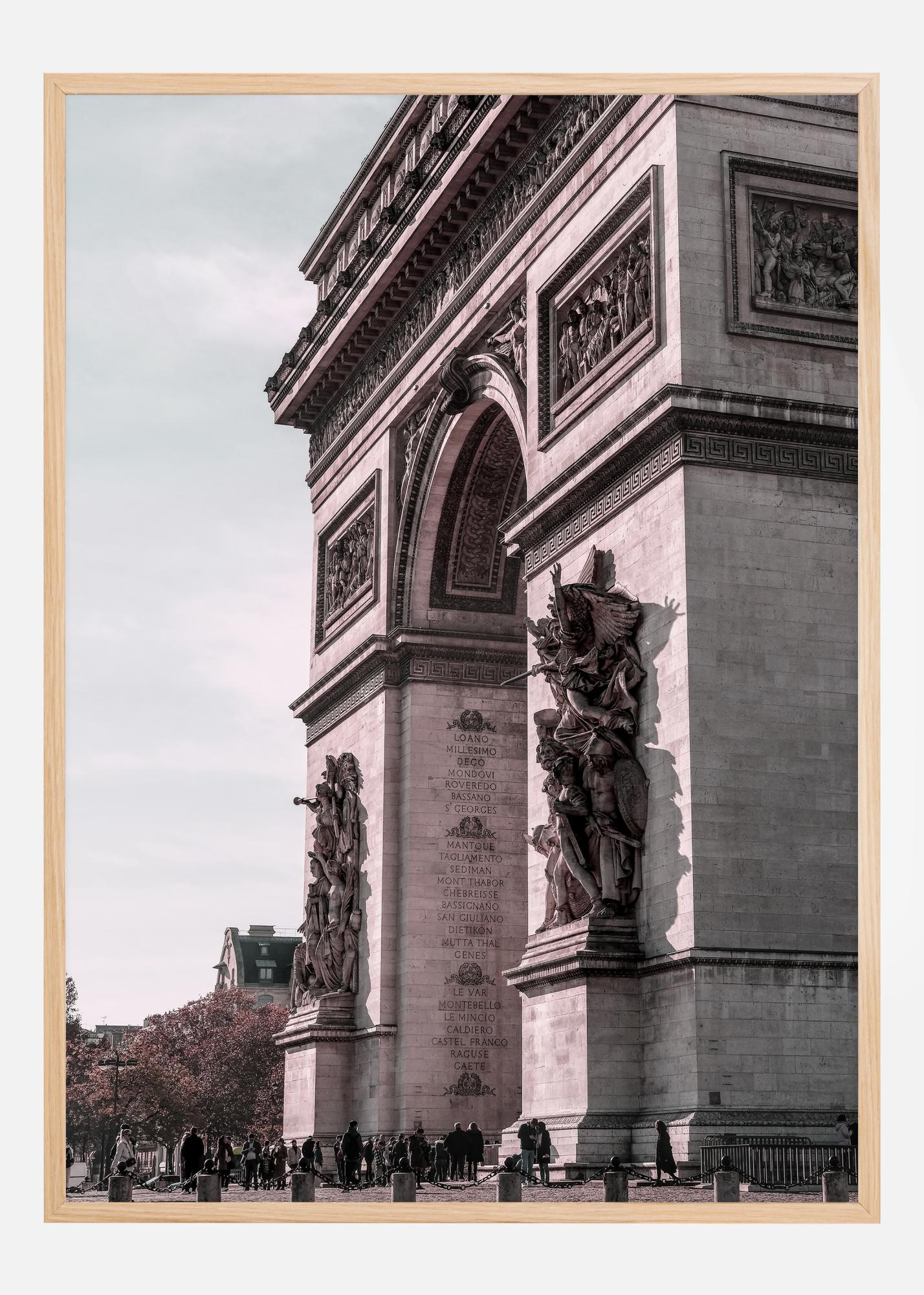 Tento elegantní plakát zdůrazňuje majestátní a detailní architekturu Vítězného oblouku v Paříži. V tomto jedinečném tisku je zachycena velkolepost a detailnost slavného orientačního bodu, od mocných soch zdobících jeho pilíře až po jemné ozdoby a nápisy, které svědčí o jeho historickém významu. S jemným růžovým tónem, který vytváří teplou atmosféru, je tento obraz poctou francouzské historii a architektuře a stává se kultivovaným doplněním každé sbírky umění a plakátů.
