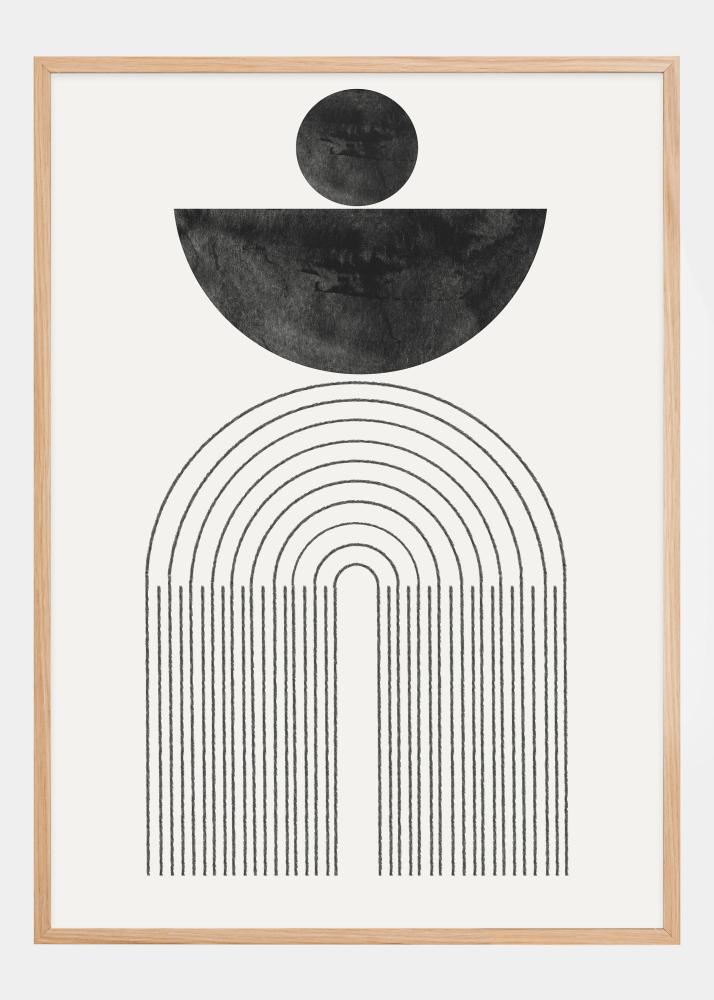 Tento odvážný a sugestivní plakát je elegantním ztvárněním měsíčních cyklů a harmonie nebeských těles. Černá půlkruh a plný kruh výše ilustrují různé fáze měsíce, zatímco smyčky dole připomínají architektonické pilíře nebo portály do jiné dimenze. Černobílý kontrast uměleckého díla přináší pocit elegance a mystiky, který obohacuje každý pokoj.