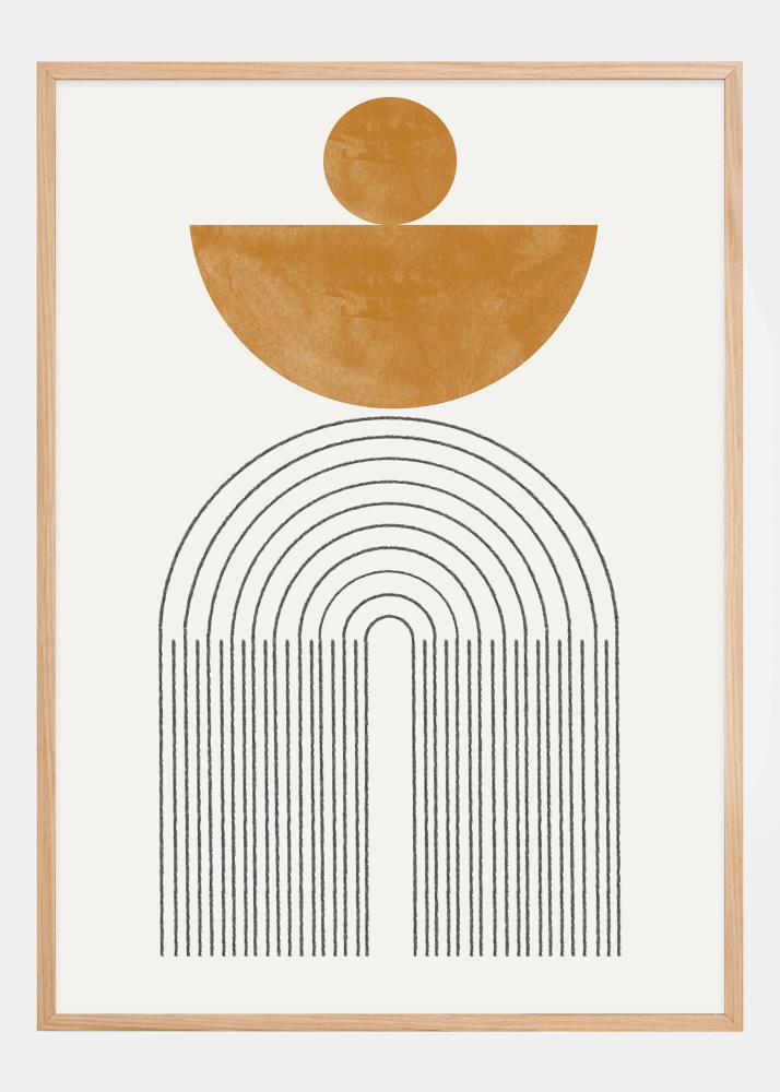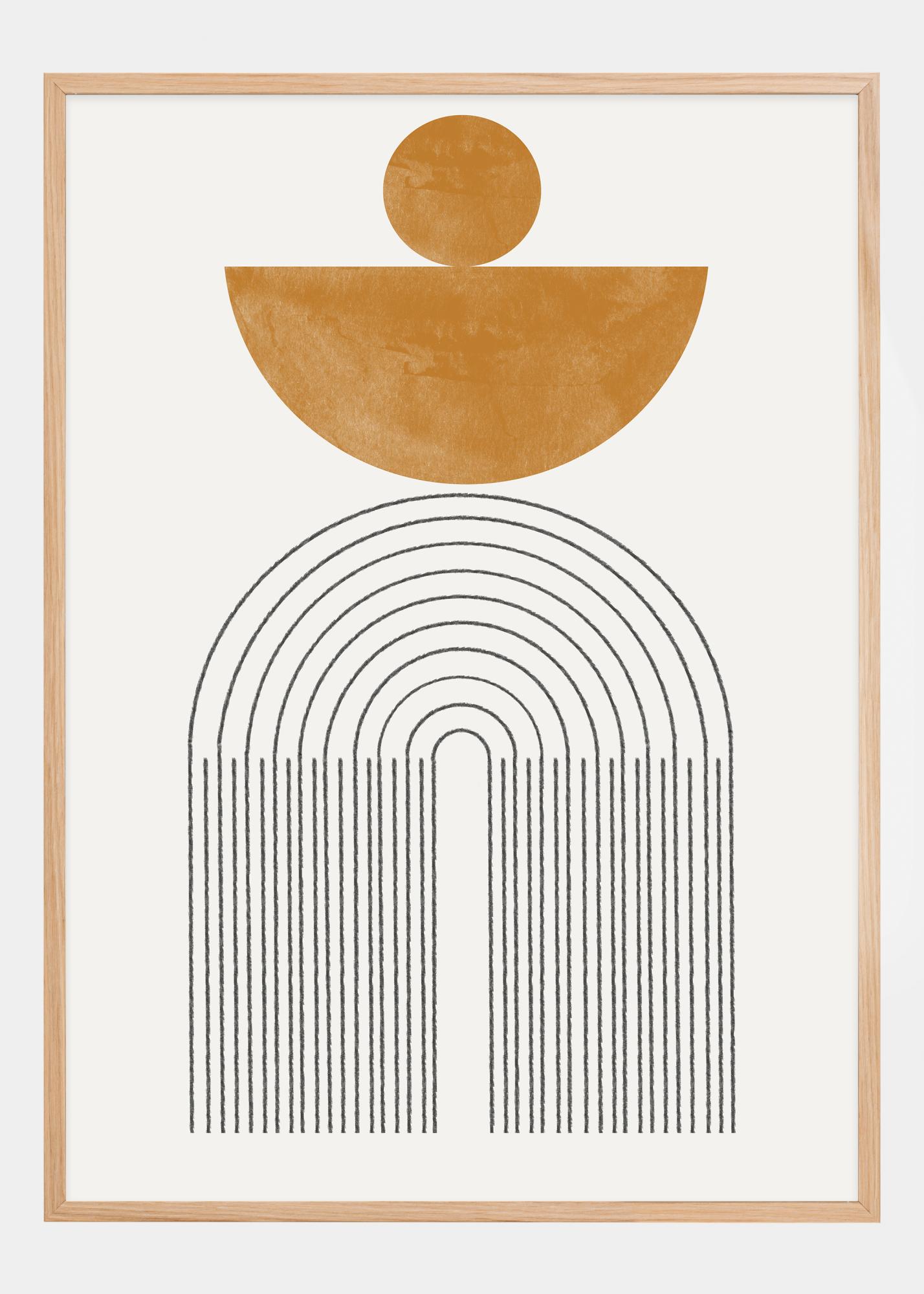 Tento elegantní plakát spojuje organické tvary a čisté linie v kompozici, která je jak uklidňující, tak vizuálně zajímavá. Velký okrový půlkruh sedí jako západ slunce nad sérií oblouků, vytvářejících architektonický pocit prostoru a hloubky. Nahoře je design vyvážen menším kruhem, připomínajícím dráhu slunce po obloze.