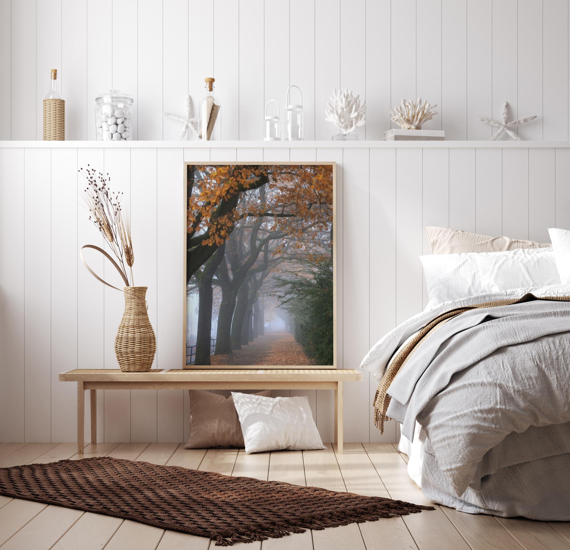 Dramatický přírodní plakát s cestou mezi vysokými stromy. Na levé straně se mohutné kmeny stromů a oranžové listí vinou k obloze. Na pravé straně kontrastují zelené jehličnany s červenými listnatými stromy. Z dálky přichází mlha, která vytváří chladnější pocit a přináší velkolepost přírody do vašeho domova.
