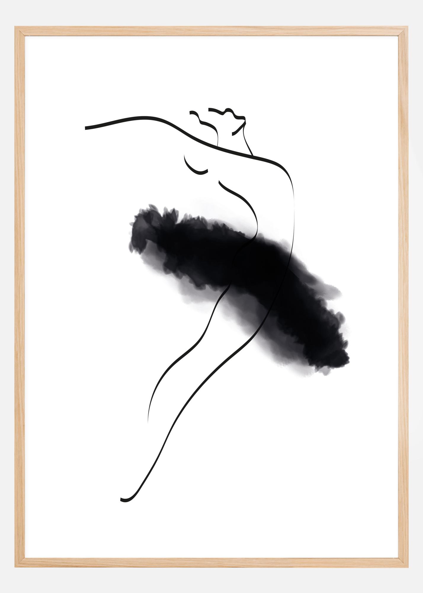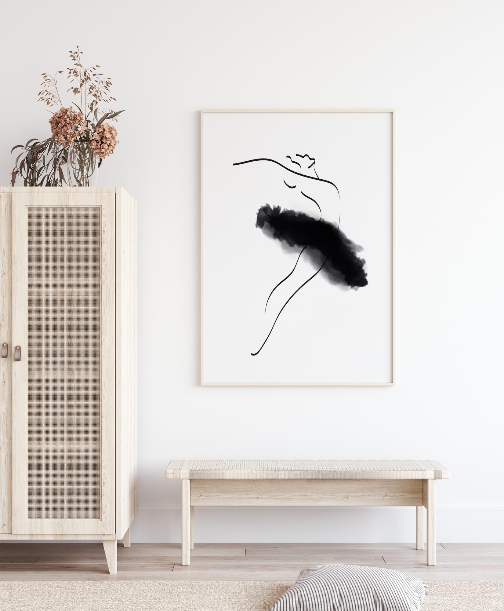 Akvarel na baletku v tenkých černých liniích s výraznější černou baletní sukní. Minimalistický a elegantní plakát, který se hodí do ložnice nebo chodby, stejně jako do obývacího pokoje nebo knihovny.