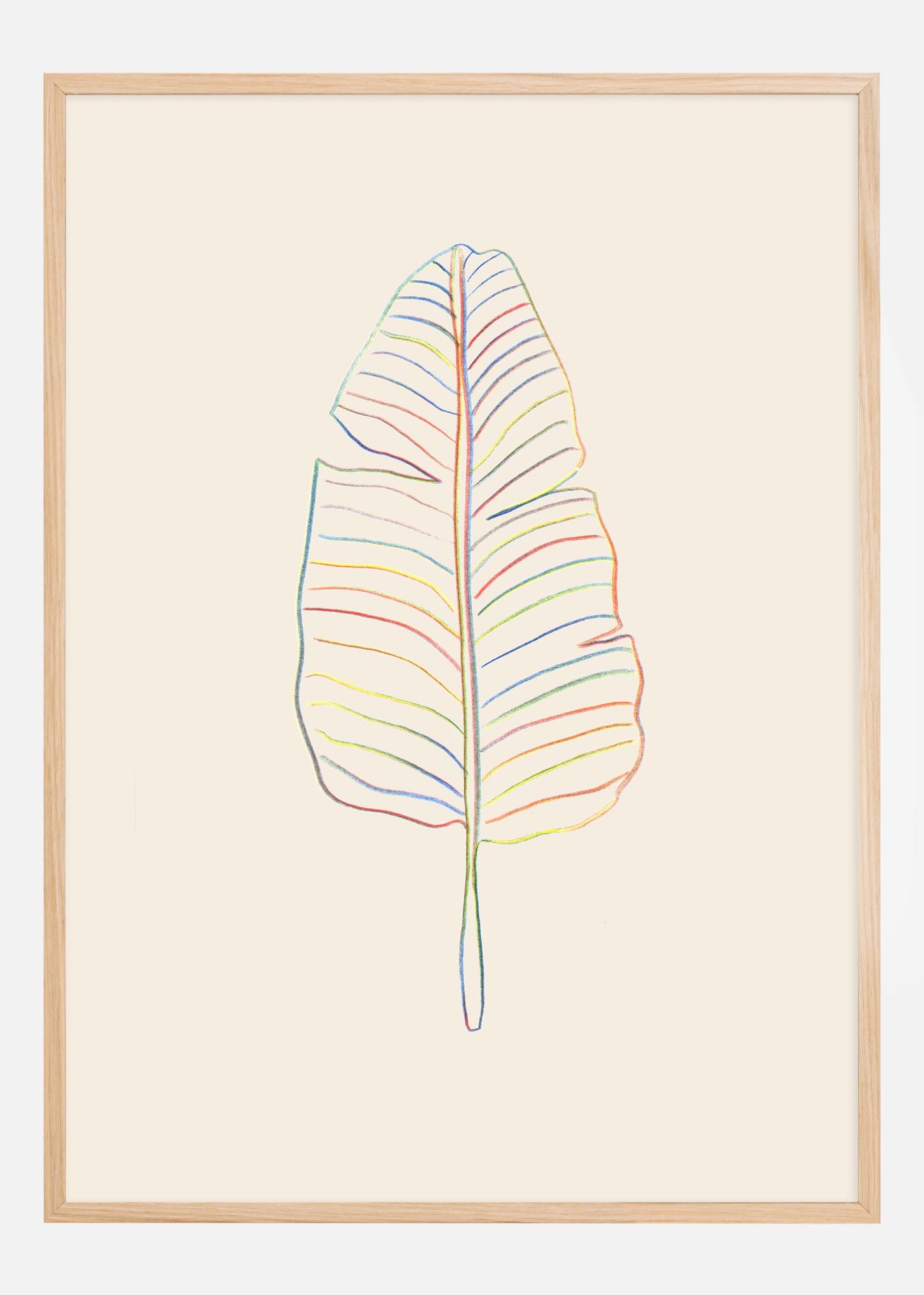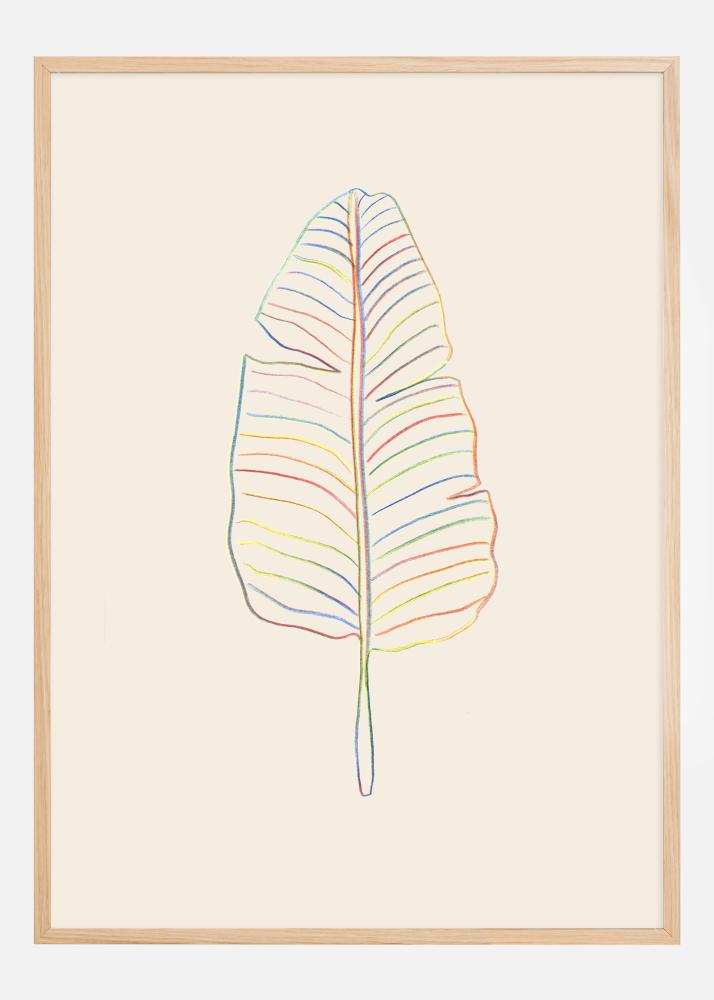 Tento živý a barevný plakát představuje kreativní interpretaci banánového listu s liniemi v spektru barev duhy. Hravý kontrast mezi přirozenými formami listu a hravými barvami přináší moderní zvrat do klasického botanického umění. Tento tisk je vynikajícím příkladem toho, jak mohou být klasické motivy transformovány s přidáním barvy, aby vyhovovaly moderní estetice.