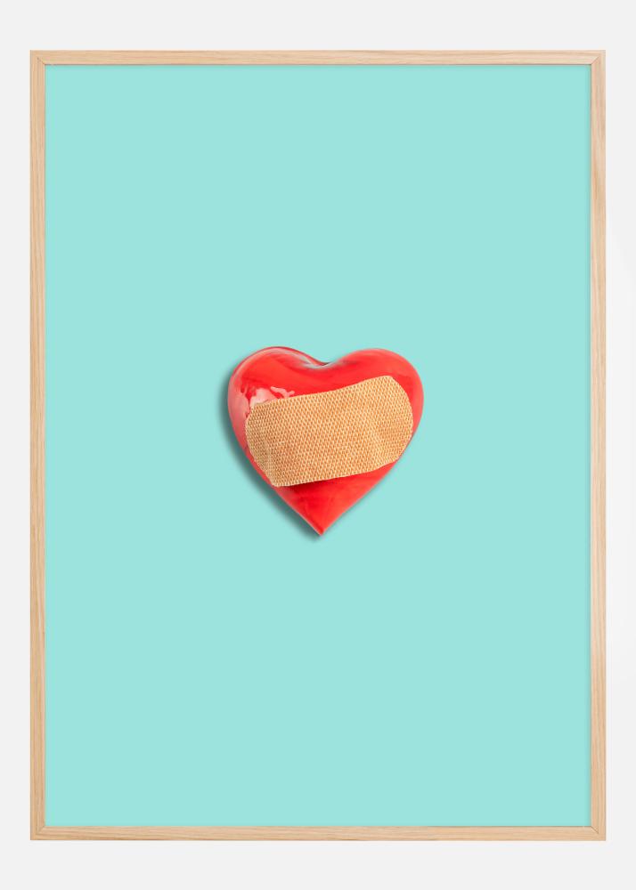 Tento podnětný plakát zobrazuje červené srdce s náplastí na uklidňujícím tyrkysovém pozadí. Symbolika je silná a otevřená interpretaci, ať už jde o hojení zlomeného srdce nebo péči o naše emoční rány. Živý kontrast mezi červeným srdcem a uklidňujícím pozadím dodává obrazu hluboký a emocionální tón.