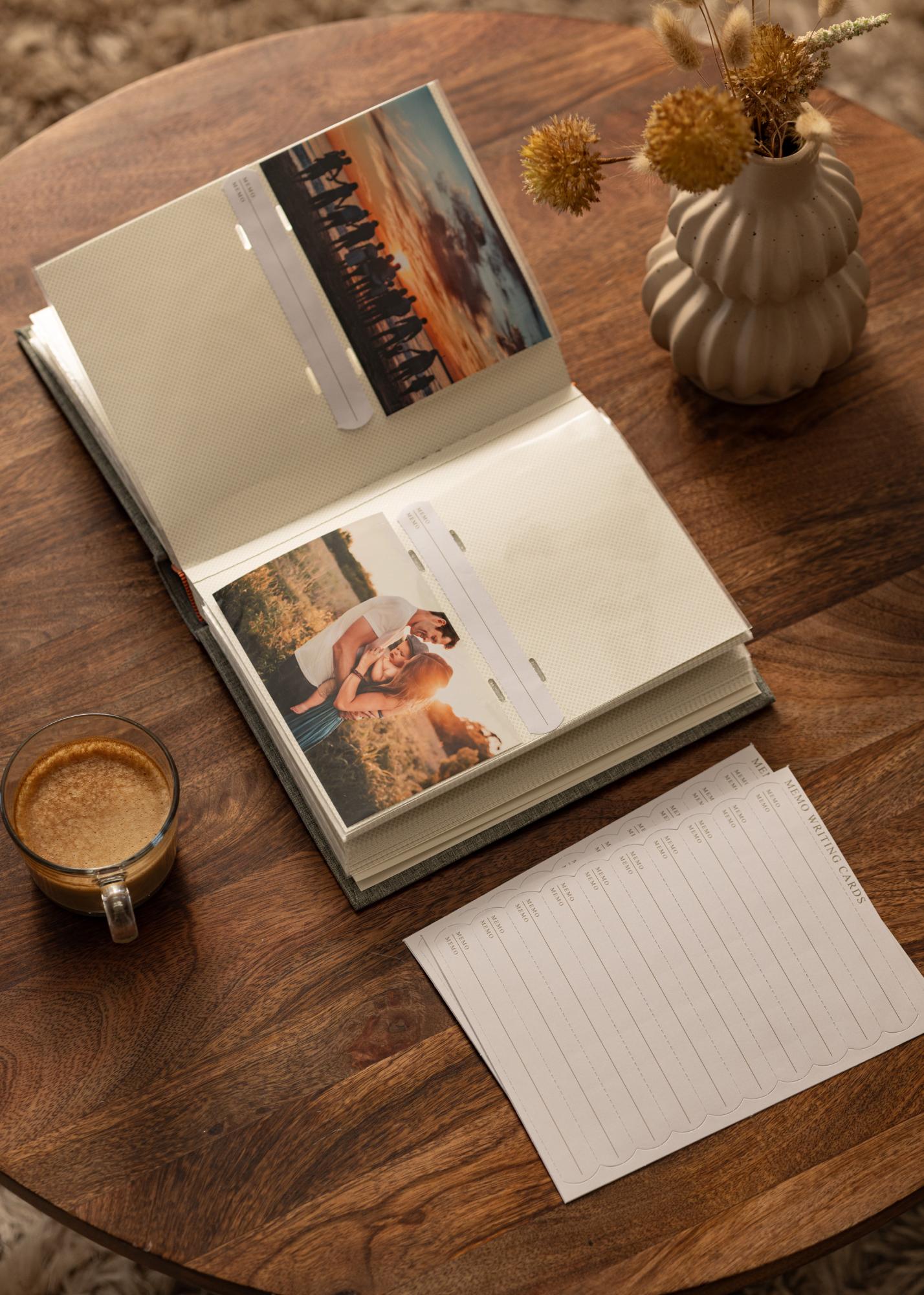 Pro každou fotografii je k dispozici políčko pro psaní a s kapsami pro každou fotografii je také snadné použití.