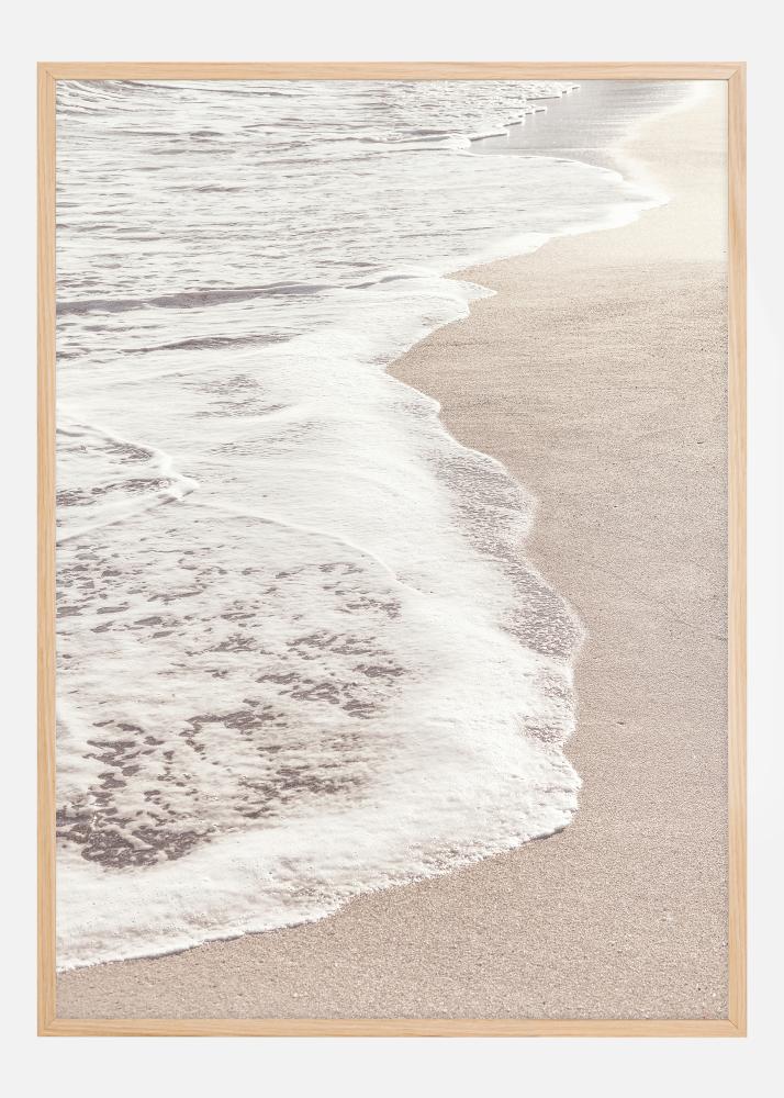 Tento působivý plakát zachycuje klidný rytmus mořských vln, které se pomalu převalí na zlatou písečnou pláž. Harmonický přechod z vody na pevninu představuje věčný cyklus moře a klidnou krásu prosté krajiny pobřeží. Měkké, neutrální barvy plakátu a jemné vzory pěny na písku přenášejí pocit klidu a nadčasového spojení s přírodou.