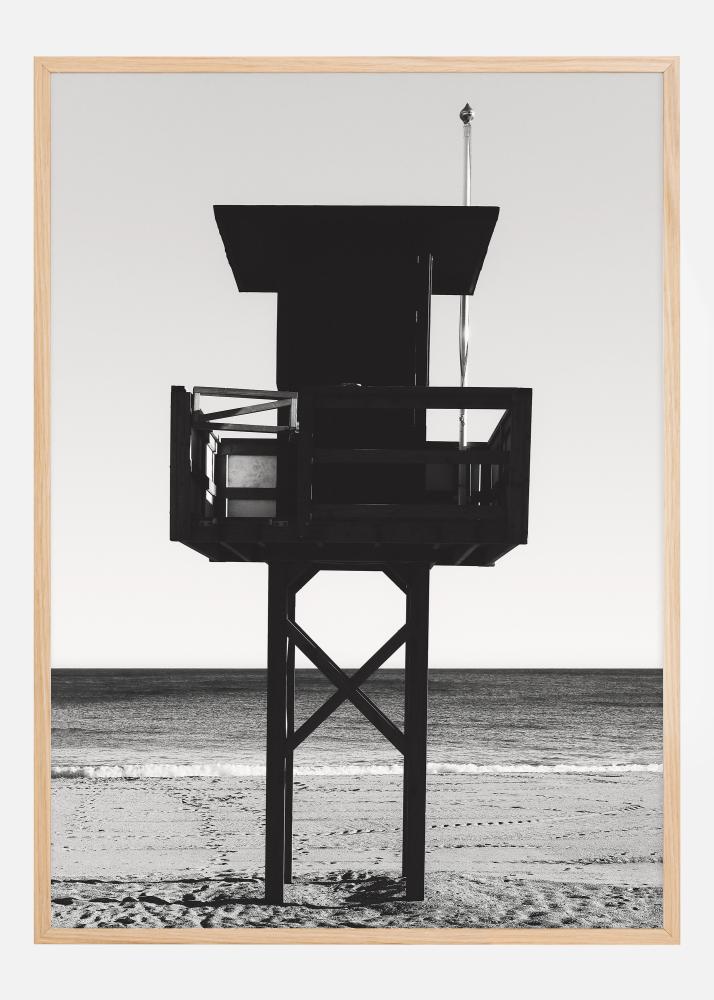 Tento monofonní plakát představuje ikonickou siluetu plážové strážní věže proti jasné obloze a klidnému moři. Silný kontrast mezi tmavou strážní věží a světlými tóny písku a nebe dodává obrázku grafickou kvalitu, která je jak úderná, tak aktuální. Obrázek, který je pořízený v úrovni očí, vytváří pocit přítomnosti a klidu, jako byste stáli přímo na pláži a dívali se na rozsáhlé moře.