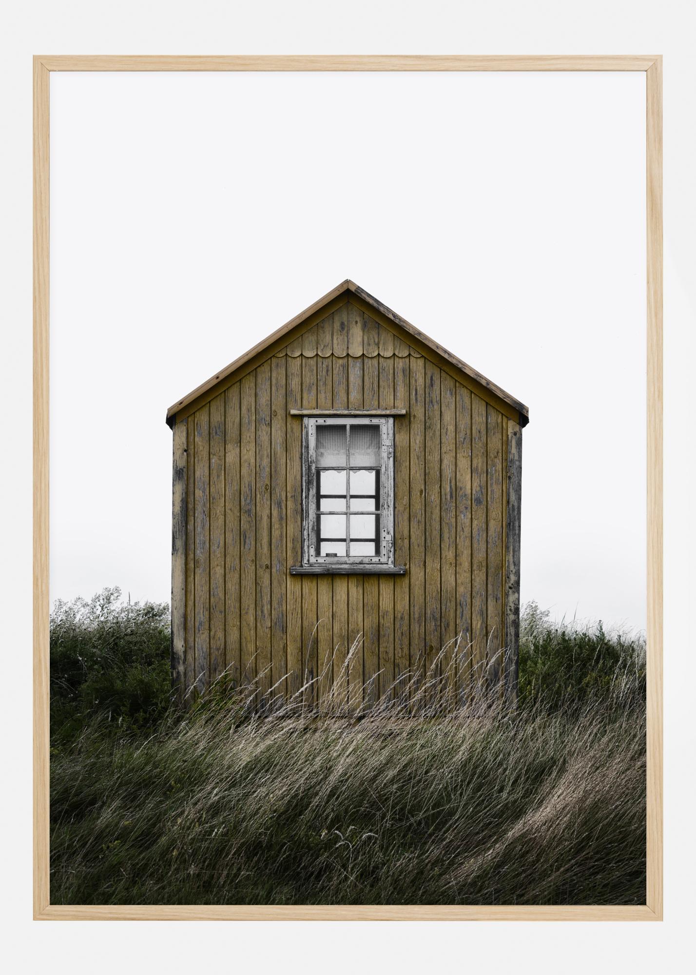 Elegantní plakát s krajinou s jednoduchou dřevěnou plážovou chatkou. Osamocená chatka stojí na větrem bičovaných písečných dunách a trávě. Pocítíte tu otevřenost a svobodu, když si ji pověsíte u vás doma.