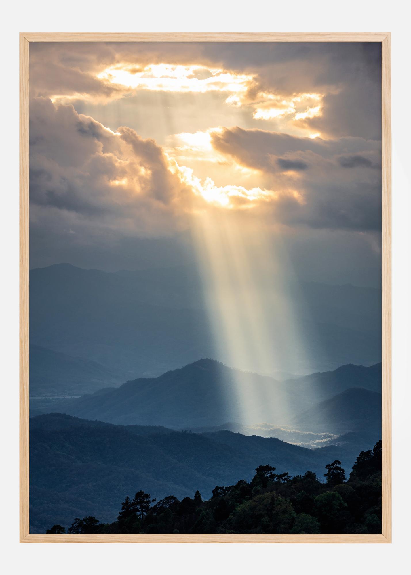 Tento inspirující plakát zobrazuje majestátní krajinu, kde sluneční paprsky pronikají mraky a osvětlují zvlněné hory. Je to scéna, která zachycuje vznešenou krásu přírody, s dramatickou oblohou v kontrastu s jemně tvarovanými horami. Stíny a světlo hrají po krajině a vytvářejí silný pocit hloubky a prostoru.