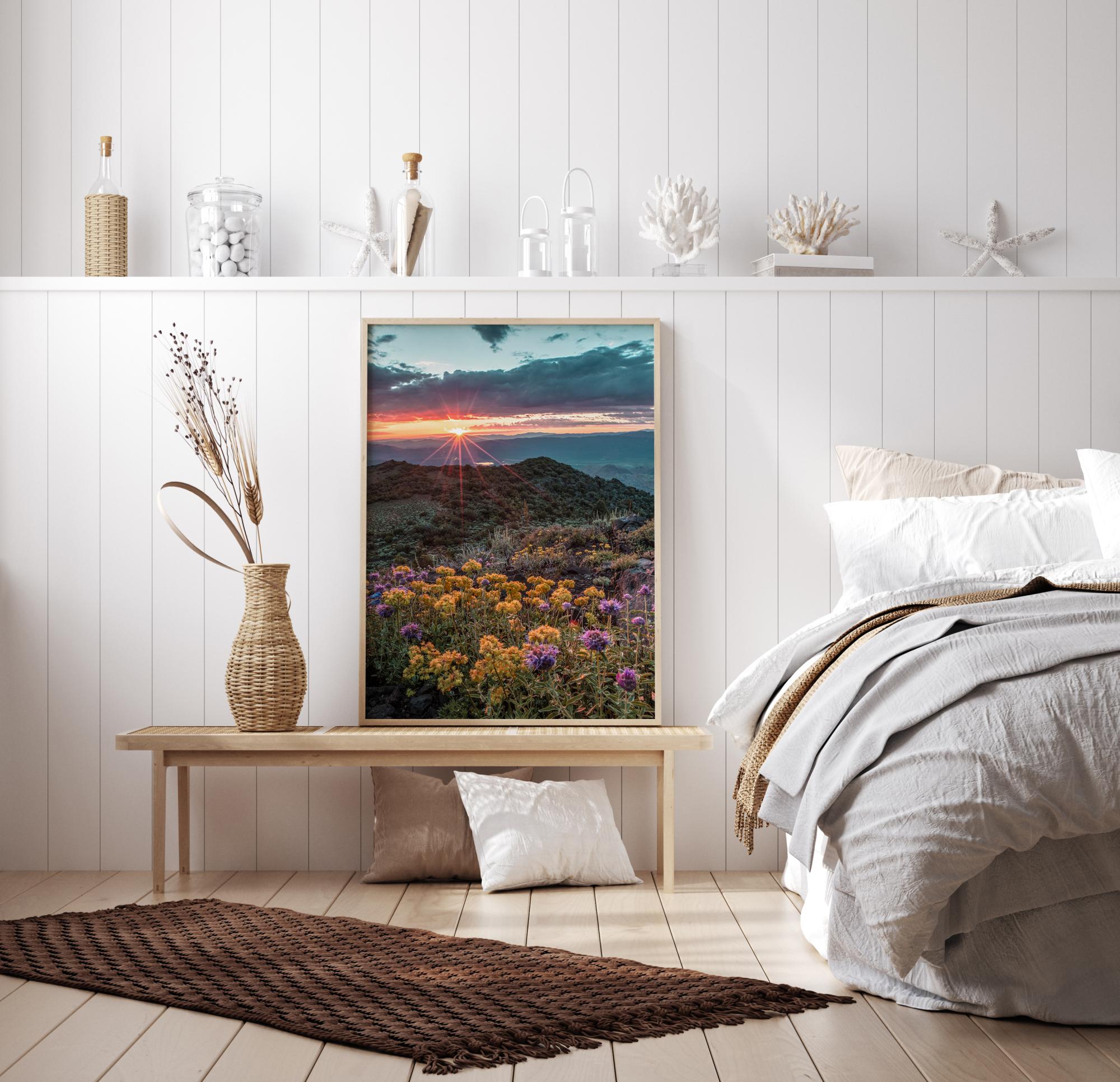 Přírodní plakát s divokými květinami na horském svahu proti úžasnému západu slunce. Krásné žluté a fialové květiny zaplňují obraz, což vede pohled k vrcholkům hor a stmívající obloze. Západ slunce vypadá jako červená hvězda, což poskytuje výrazný ohniskový bod. Zavěste toto dílo na svou zeď, abyste doma zažili část přírody.
