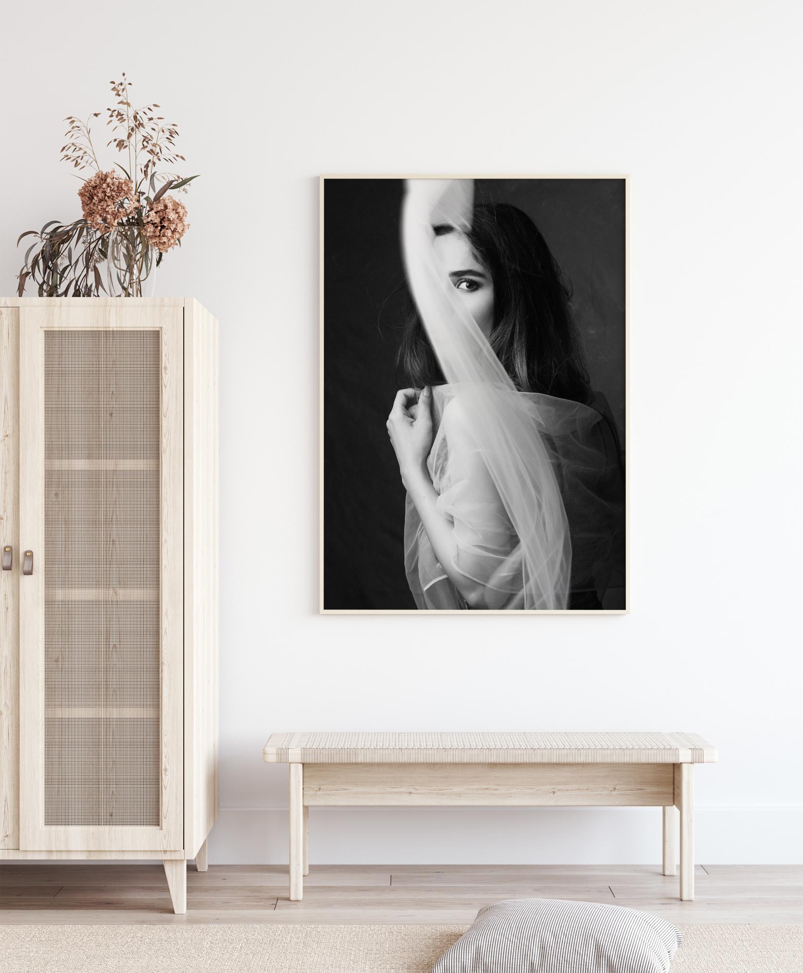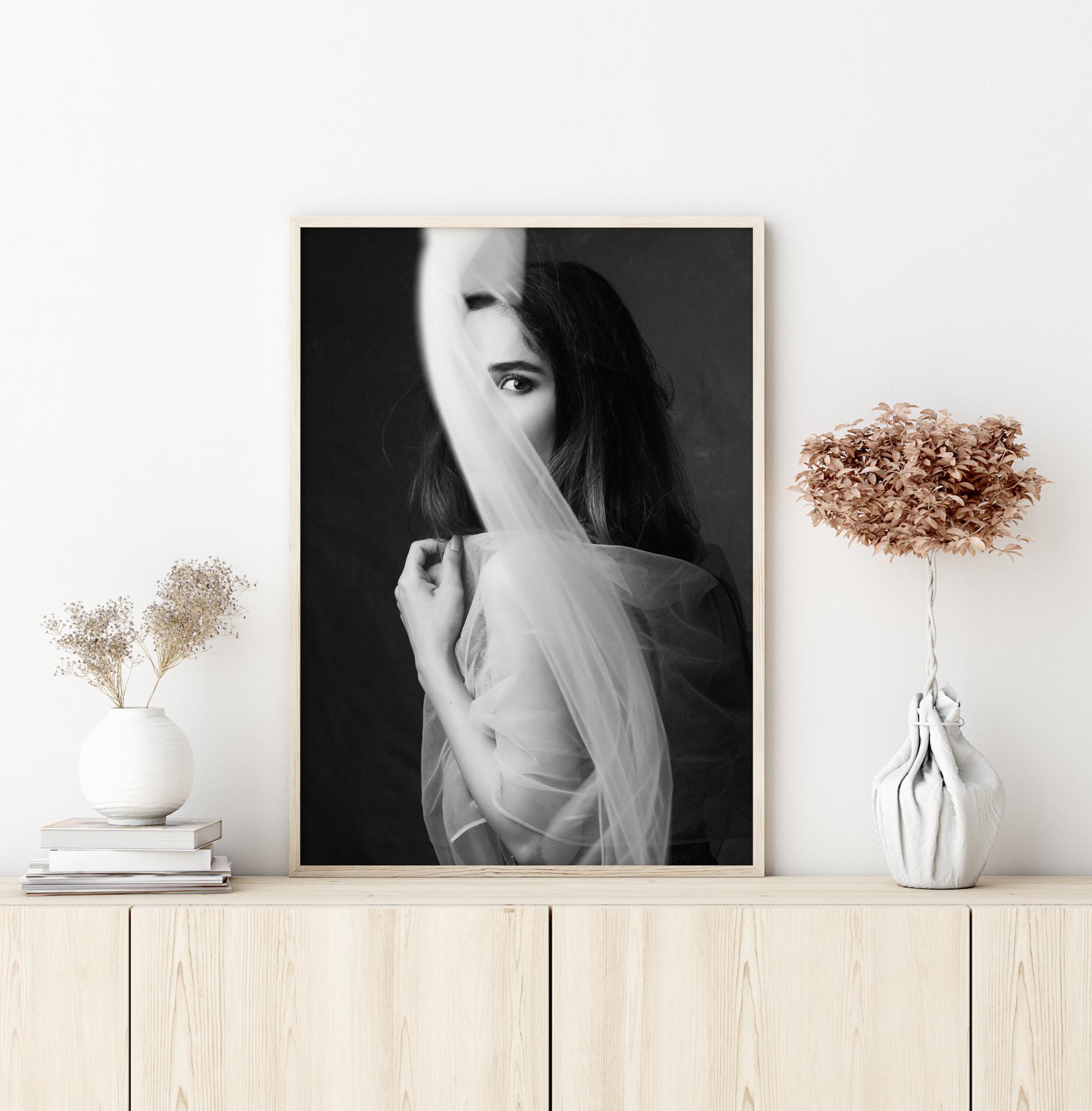 Smyslná fotografie ženy, která se schovává za záclonou. Měkký závoj záclony přitahuje pozornost k tváři ženy. Tento plakát vás zavede na klidné místo, kde se můžete spojit.