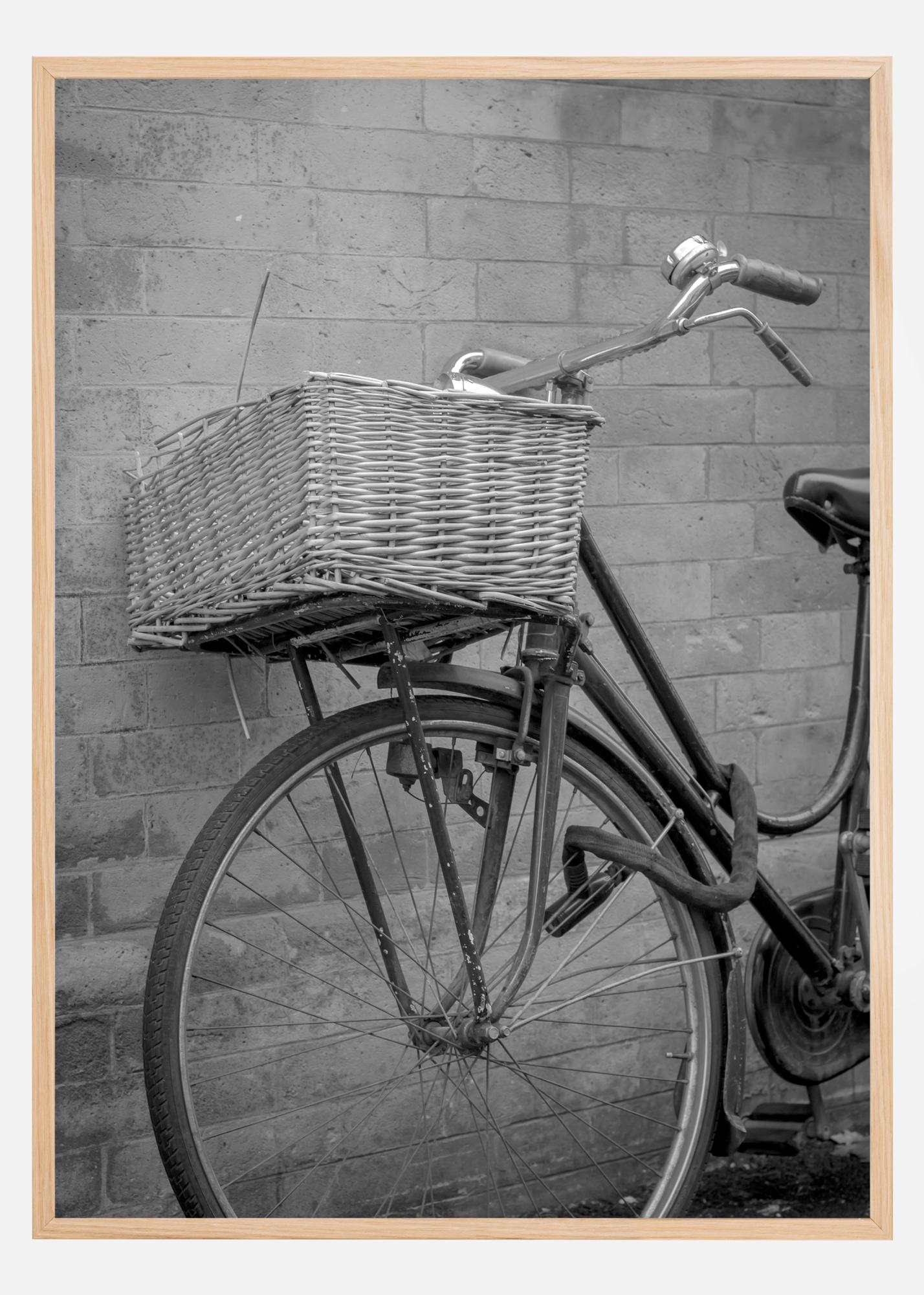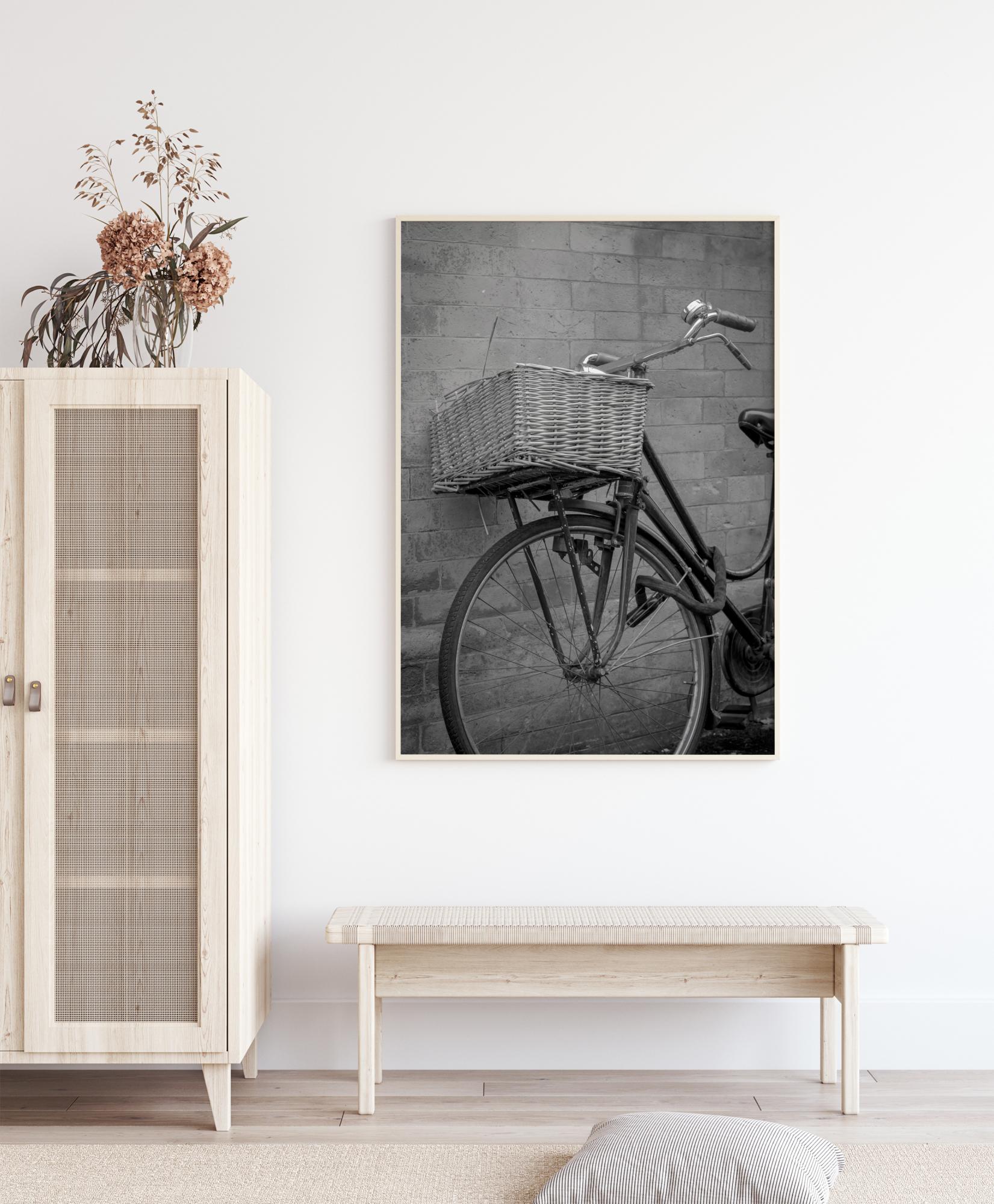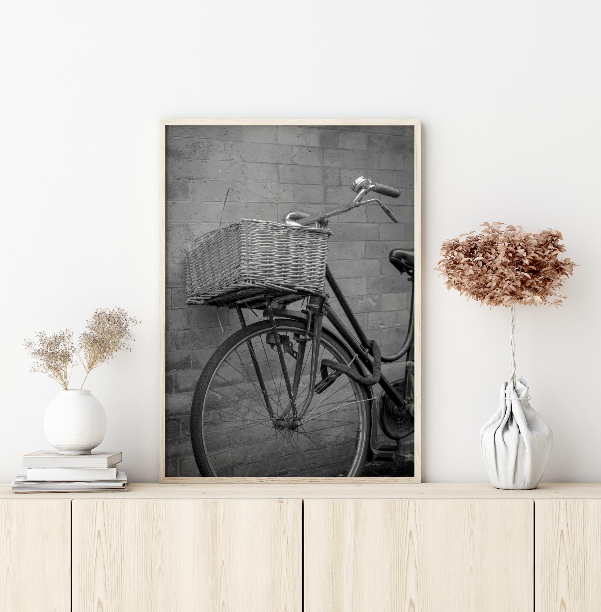 Plakát zátiší s kolem opřeným o cihlovou zeď. Košík na kole je v centru pozornosti a kontrastní černý rám a zámek na kolo vedou pohled po plakátu. Zavěste tento jednoduchý, ale elegantní obraz na světlou stěnu pro vkusný efekt.