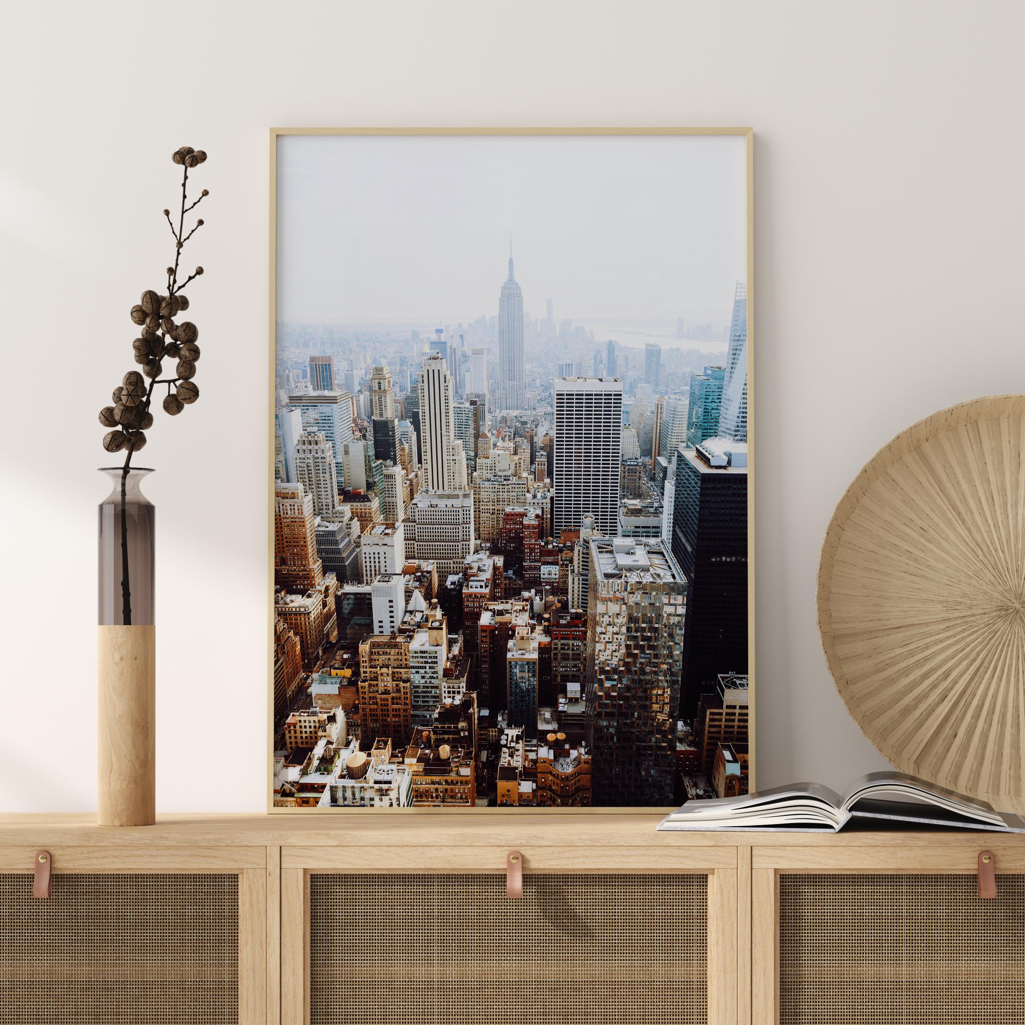 Letecký plakát s centrem New Yorku a Empire State Building v dálce. V popředí začínají barvy jako zlatá a žlutá, než se na pozadí mísí s chladnějšími modrými a šedými tóny. Je to ustupující fokus obrazu, který tvoří hloubku. Přineste si toto dílo domů a užijte si umělecké vyjádření městského života.