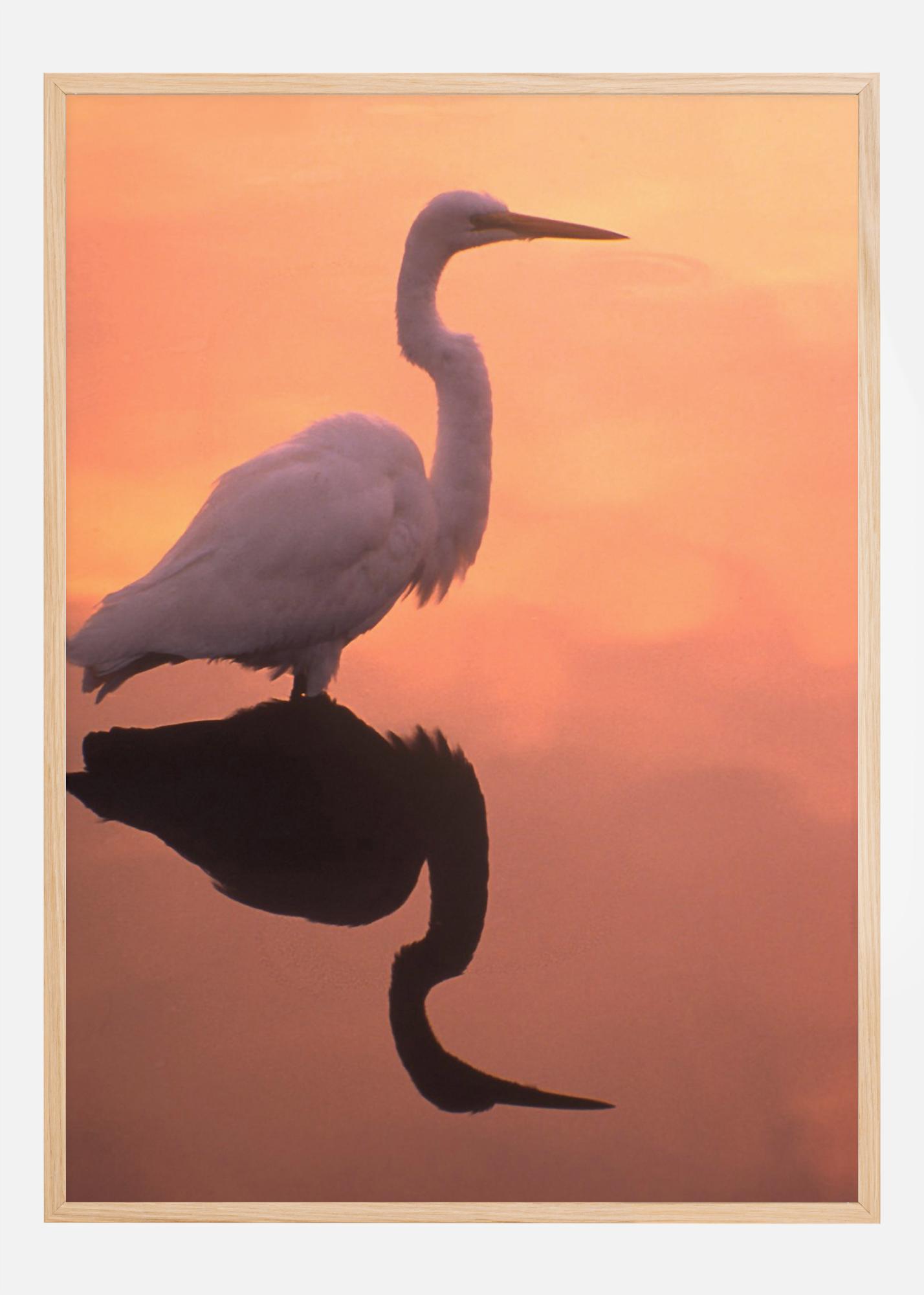 Plakát divočiny s bílým čápem proti nádherné oranžové obloze. Jednoduchý odraz čápa ve vodě také zobrazuje odraz oblohy. Měkké oranžové a žluté barvy jsou ideální pro přinesení tepla a klidu do domova.