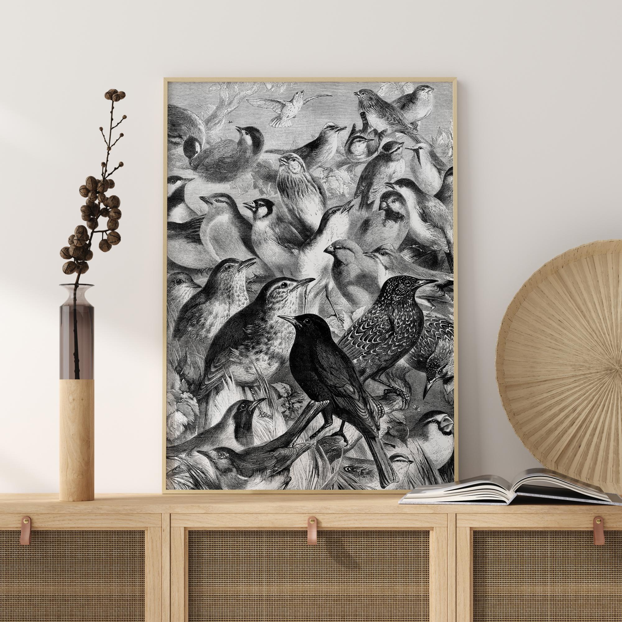 Černobílý plakát s různými ptáky. Naučte se vše o ptácích pomocí tohoto tisku s různými britskými ptáky. Zaměstnejte se objevováním ptáků na obrázku a naučte se o nich něco. Nechte je ještě více vyniknout tím, že obrázek pověsíte na světlou zeď.