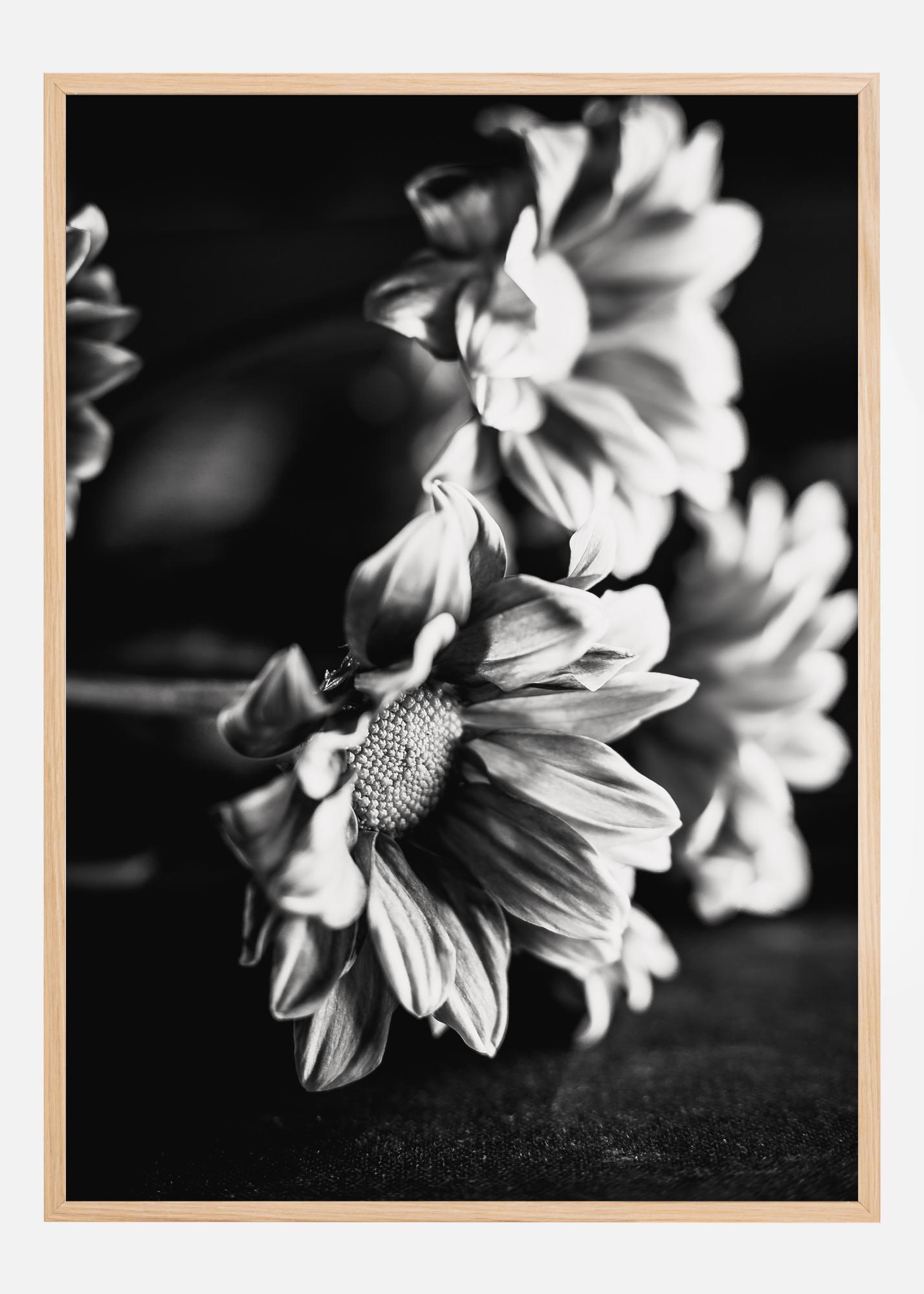 Tento plakát zobrazuje květinové aranžmá v černobílé, kde stíny a světlo spolupracují, aby zdůraznily jemné obrysy a texturu každého okvětního lístku. Zaměření obrázku na kontrast mezi tmavým a světlým zachycuje krásu květin způsobem, který poskytuje nové ocenění jejich tvaru a struktury. Tento plakát je sofistikovanou a uměleckou interpretací divů přírody, ideální pro vytvoření pocitu klidu a krásy v jakémkoli prostoru.