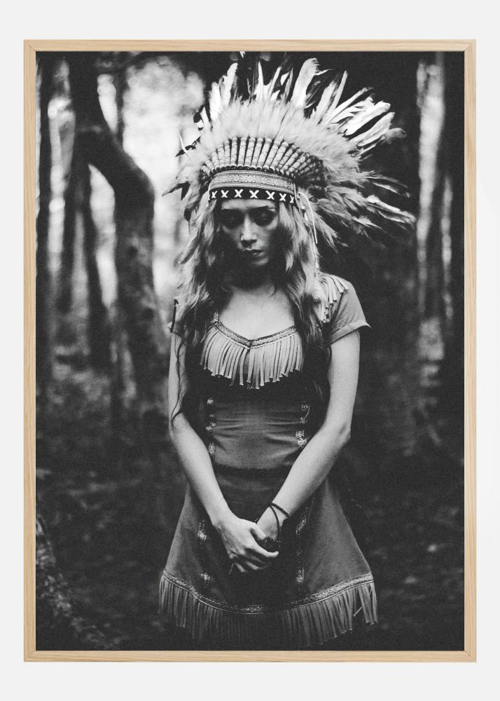 Portrétový plakát s indiánskou dívkou v lese. Tento silný černobílý obraz nechává bílé peří na čelence vyniknout proti tmavému kmeni stromu. Nechte se unést přemýšlivým okamžikem, když sklání pohled ke svým sepnutým rukám.